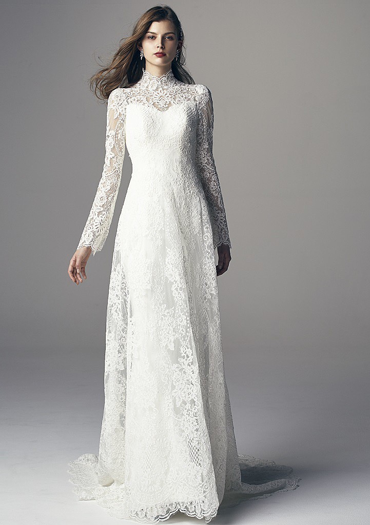 露出を控えた長袖のレース生地からは、適度な肌見せが大人っぽい印象にしてくれます。長袖スタンドカラーが挙式に相応しい上品さとクラシカルさを演出する総レースのマリエ。ご希望に応じて合せられるサッシュベルトにより披露宴でのイメージチェンジも可能。