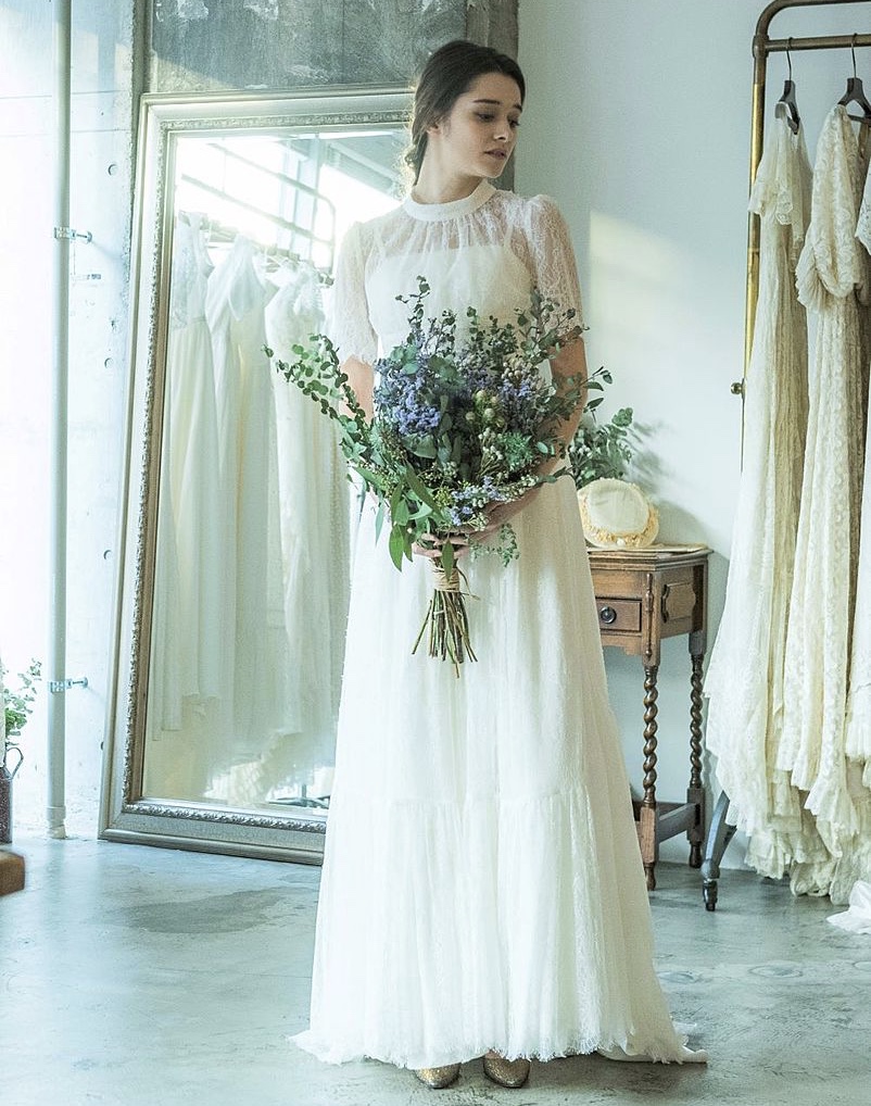 繊細なレースを使用し、花嫁さんを優しい印象に包み込んでくれるドレス。ウエストからではなく、胸下から切り替えのあるエンパイアラインのドレスは、堅苦しくならない印象に。スカート丈が短めなので、大人カジュアルなスタイルに仕上げてくれます。