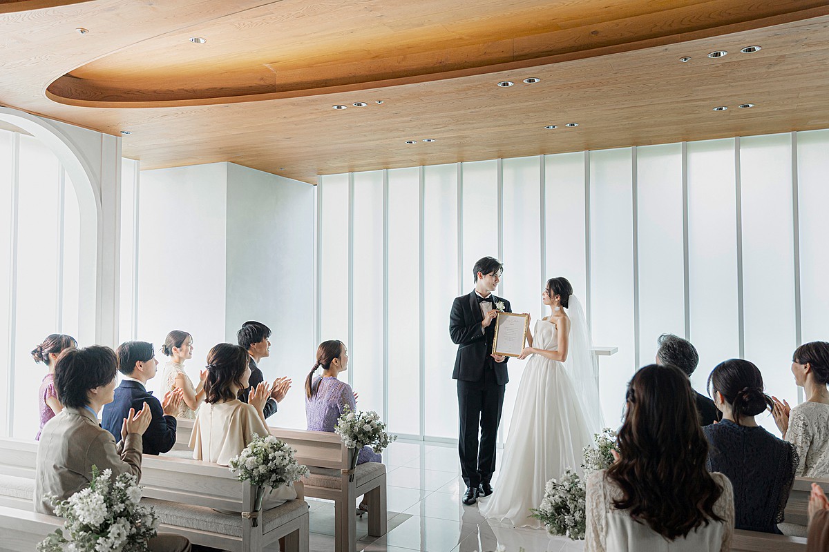 チャペル全体が横長の造りに設計されているので、一番後ろの席からもふたりの表情をしっかりと見ていただくことができますよ◎
