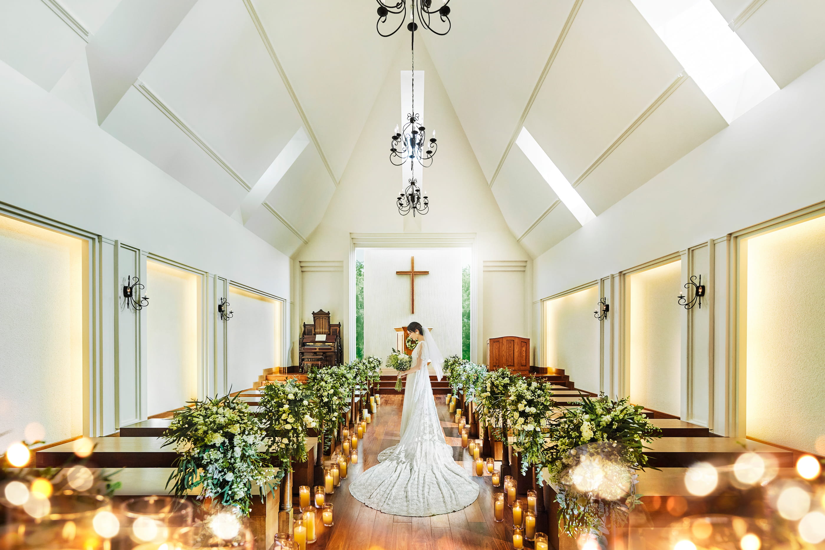 このチャペルは、天井の高い開放的な空間で、優雅な雰囲気が特徴。
