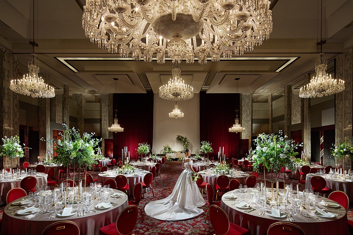 もう1つの披露宴会場「ボールルーム」は都内最大級の天井高10mを誇り、頭上にフランスバカラ社製のシャンデリアが輝くラグジュアリーな会場。