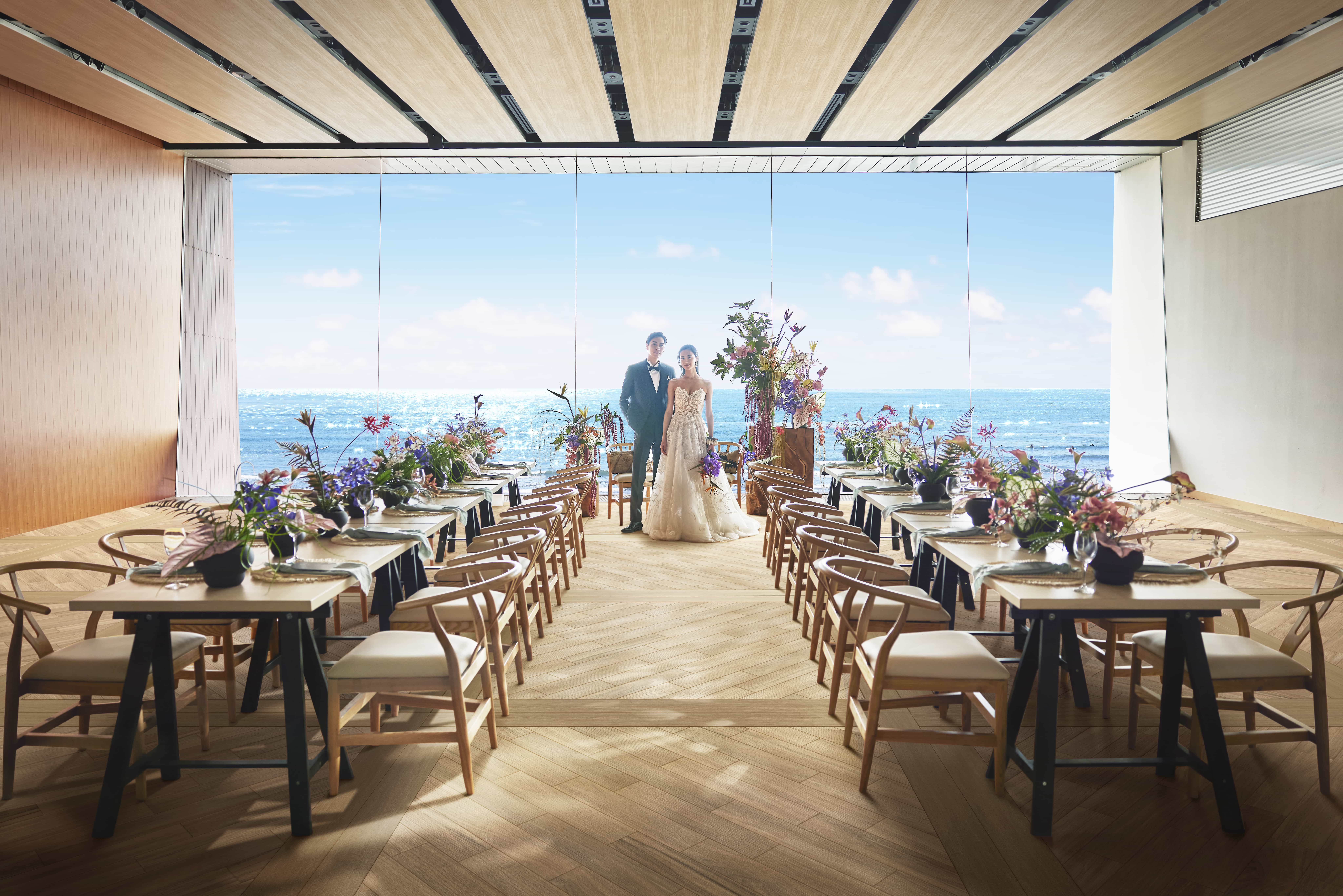少人数ウエディングにぴったりな「スカイラウンジ」は、水平線と青空に続くように広がる空間。