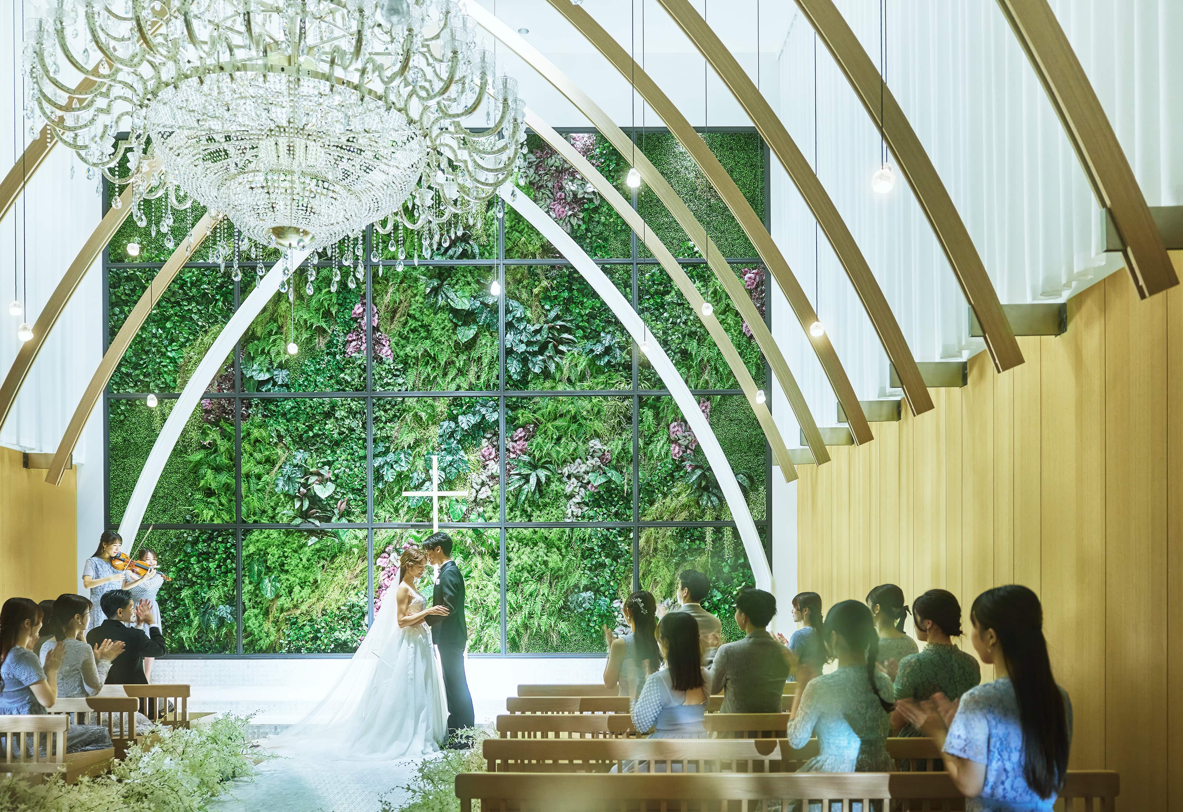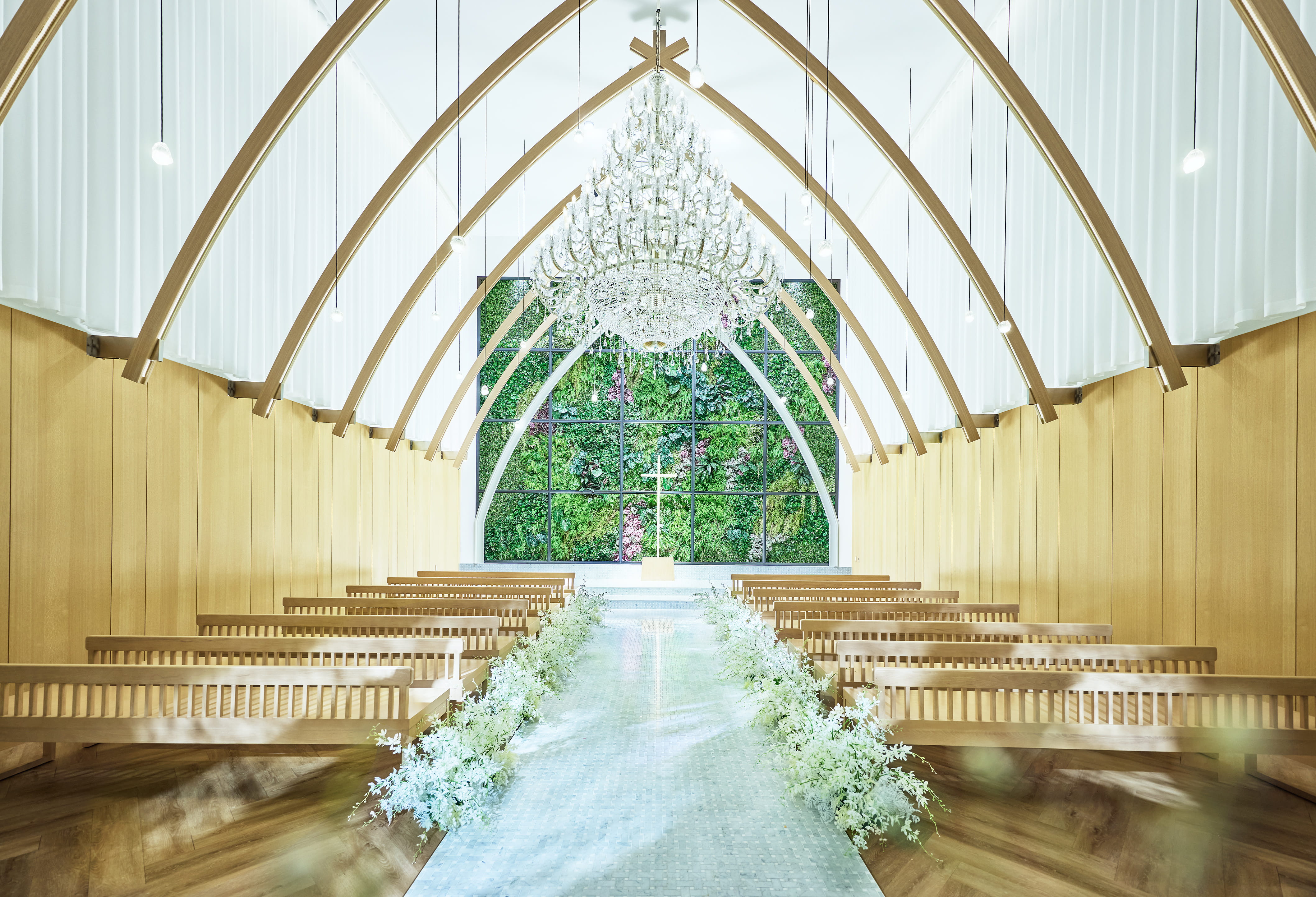 天候に左右されない緑と木の温もりあふれるチャペルは、天井高7mもの広々とした空間です。