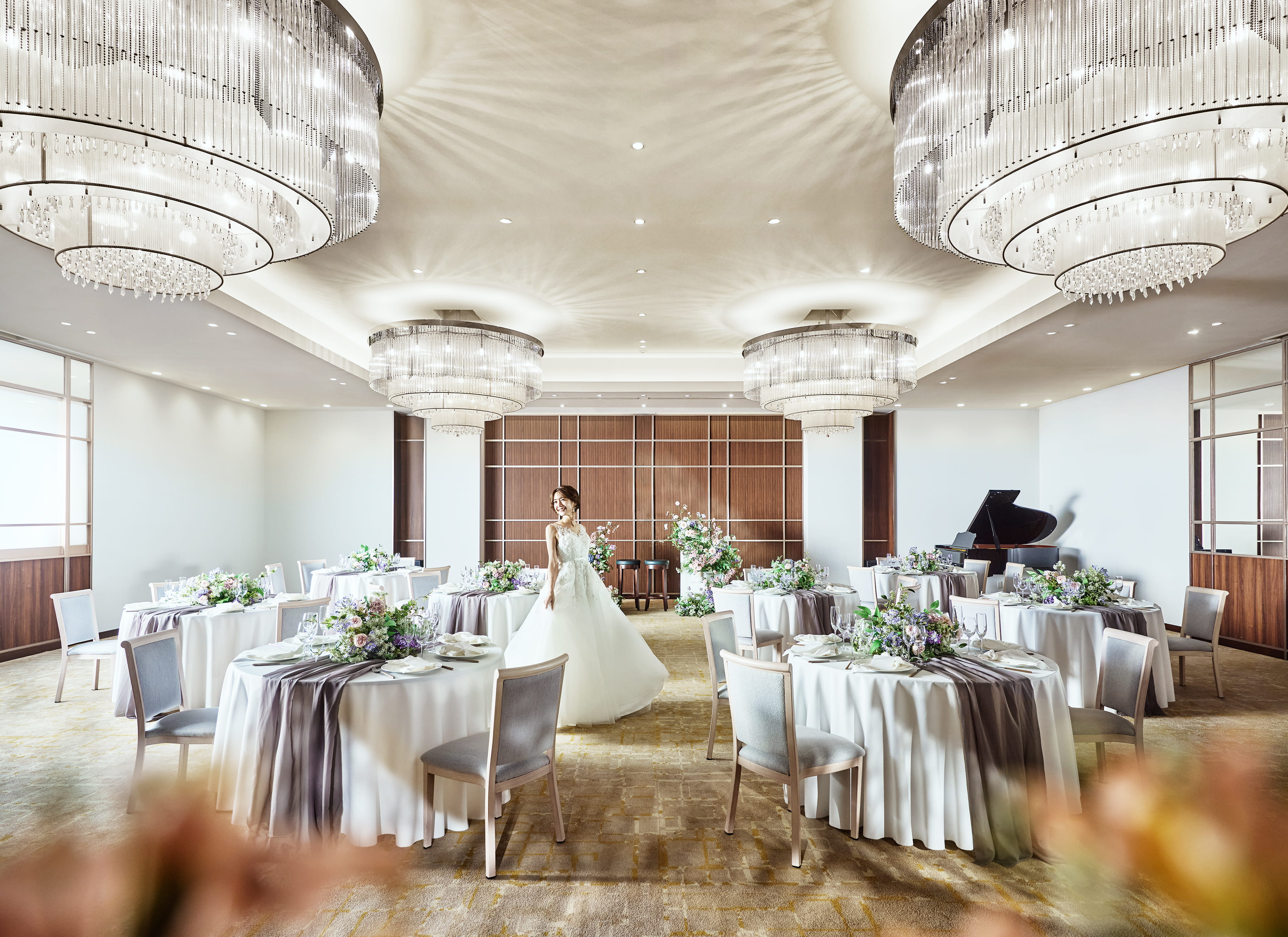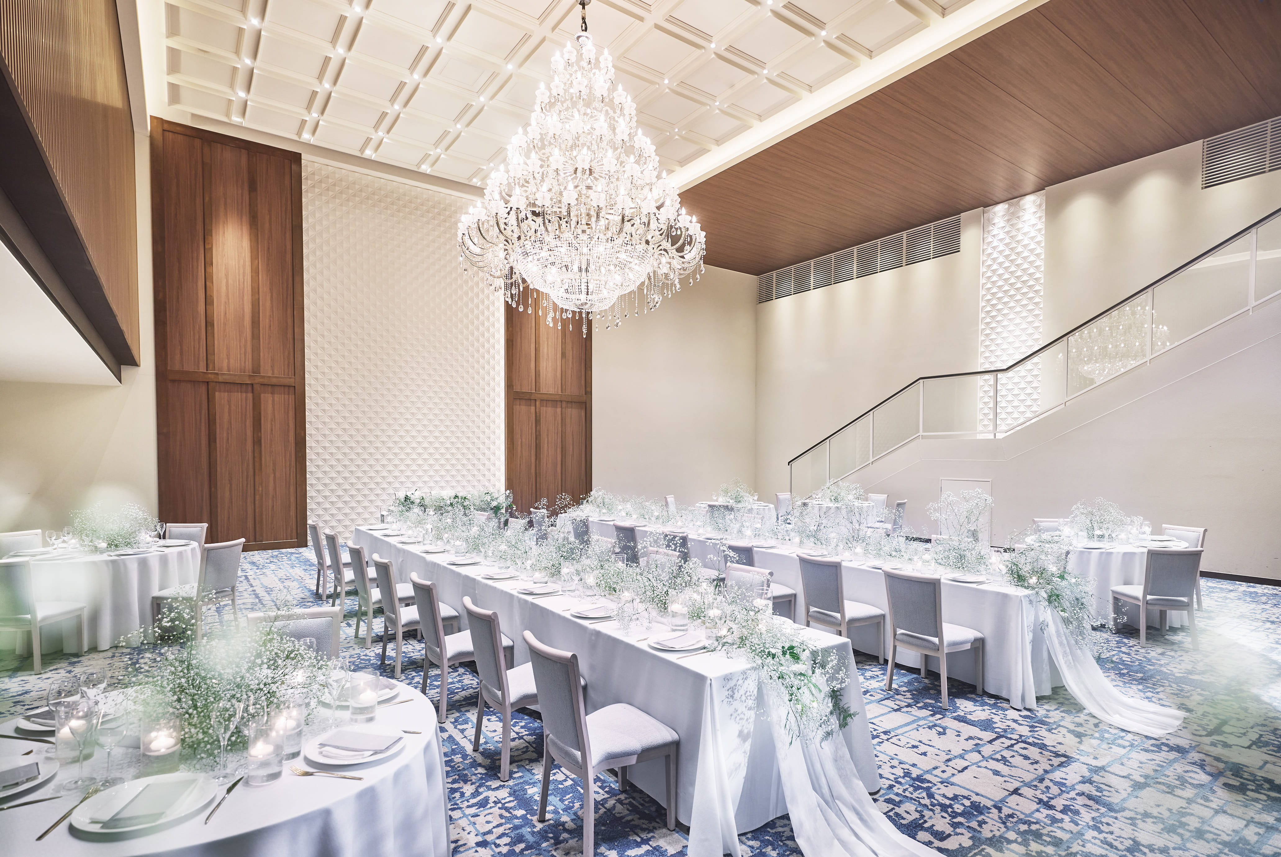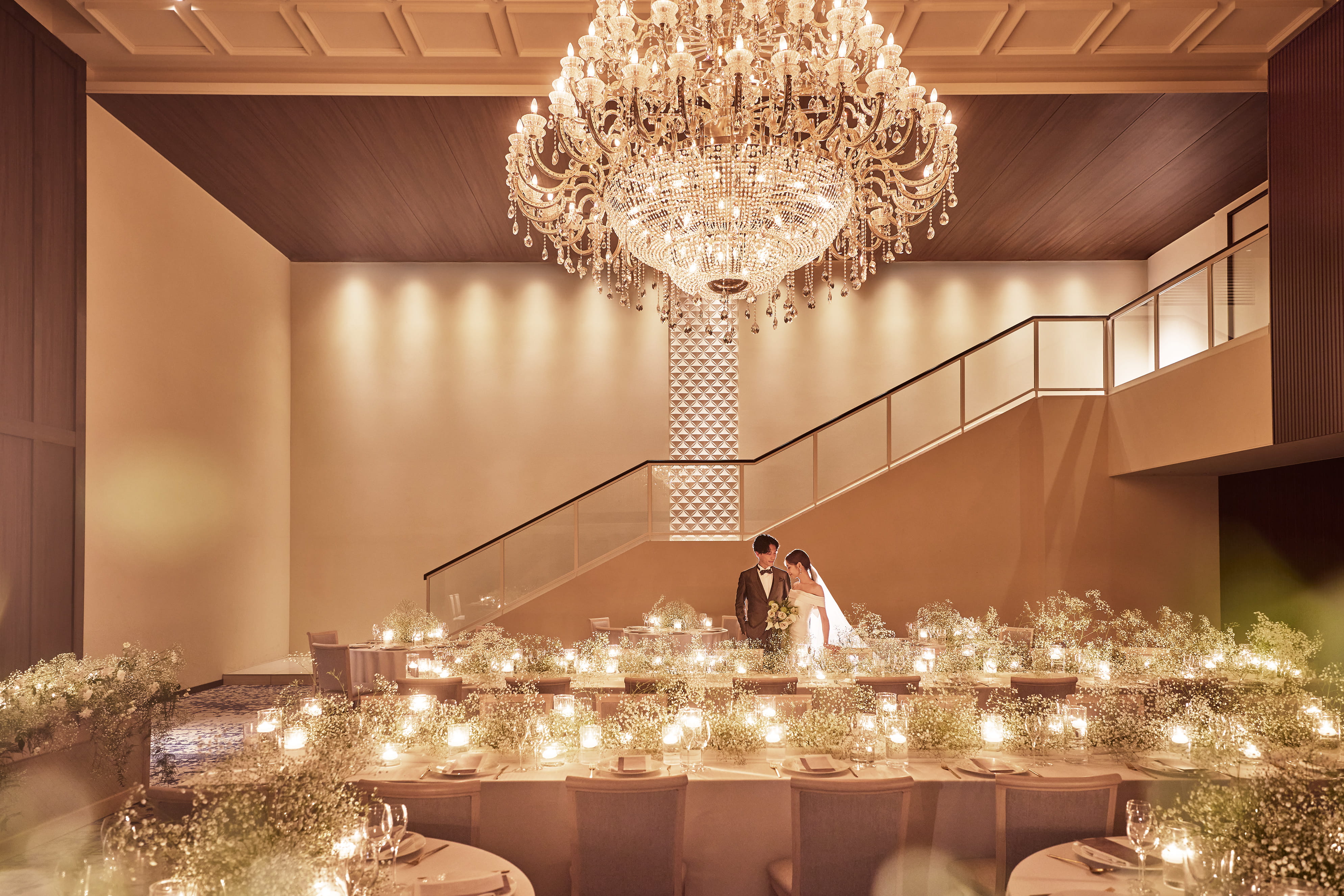 天井には煌びやかなシャンデリアが配され、階段入場や巨大スクリーンを使用した華やかな演出など、ラグジュアリーな雰囲気のデザイン空間です。
