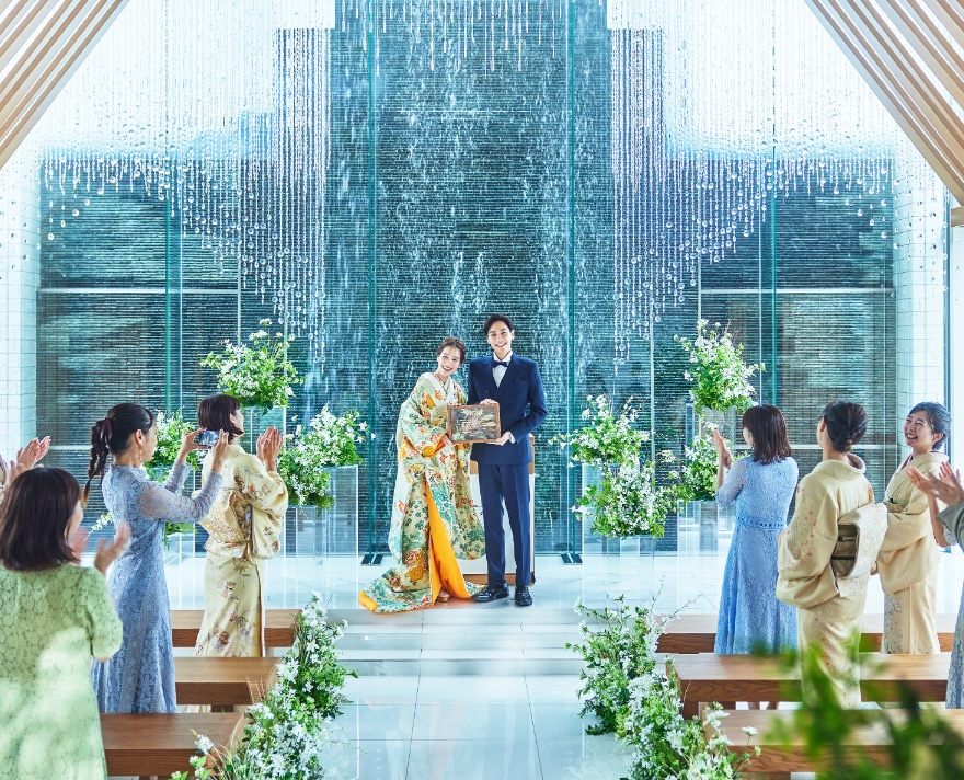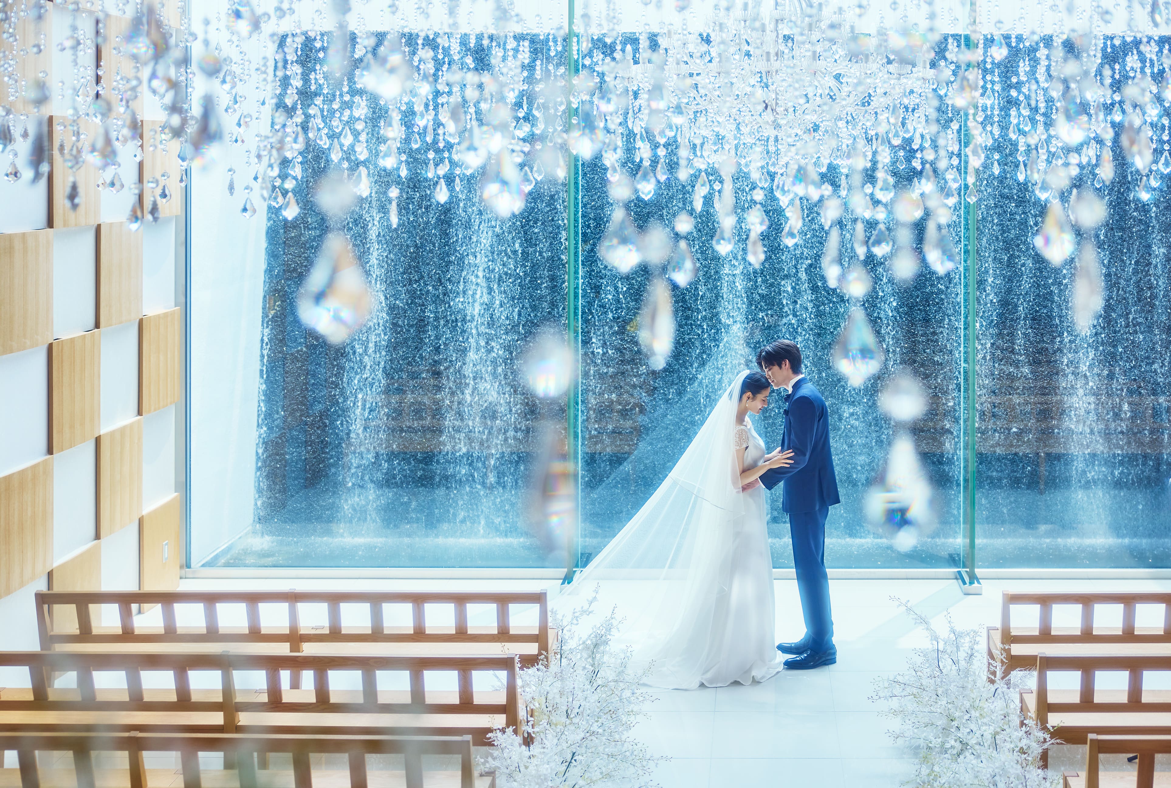 荘厳な滝の流れと射し込む陽光が美しく溶け合う幻想的なチャペルは息を呑むほど感動的で、会場見学時には扉が開いた瞬間、言葉を失ってしまう方も多いほどです。