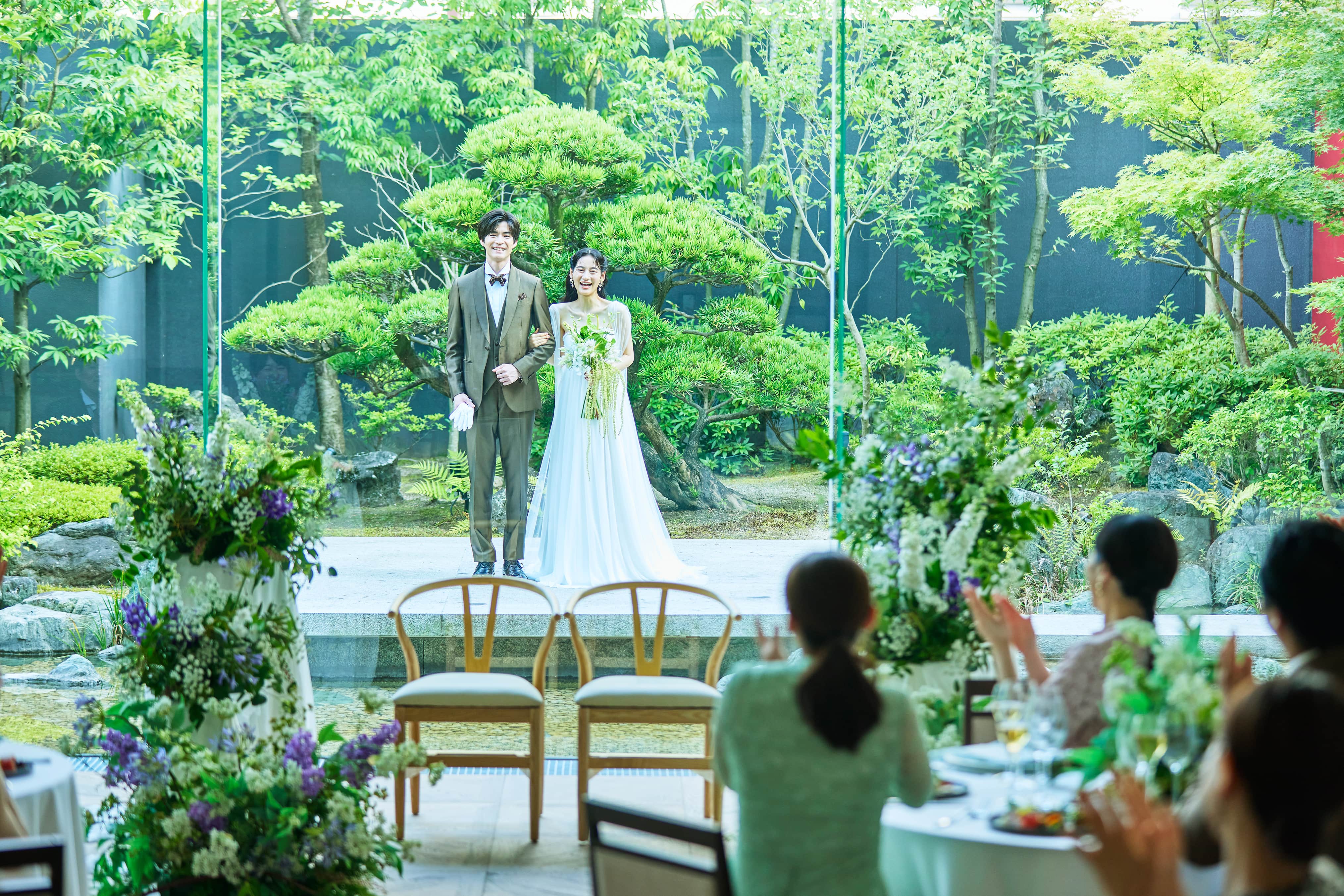 新郎新婦様の背景には日本庭園が一面に広がり、四季折々の風情を感じながらパーティーをお過ごしいただける特別空間です。