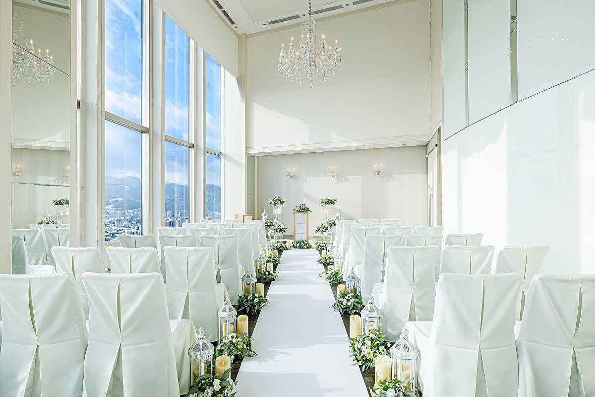 大きな窓が配置され、たっぷりと降り注ぐ自然光が白い大理石のバージンロードと二人を美しく照らします。