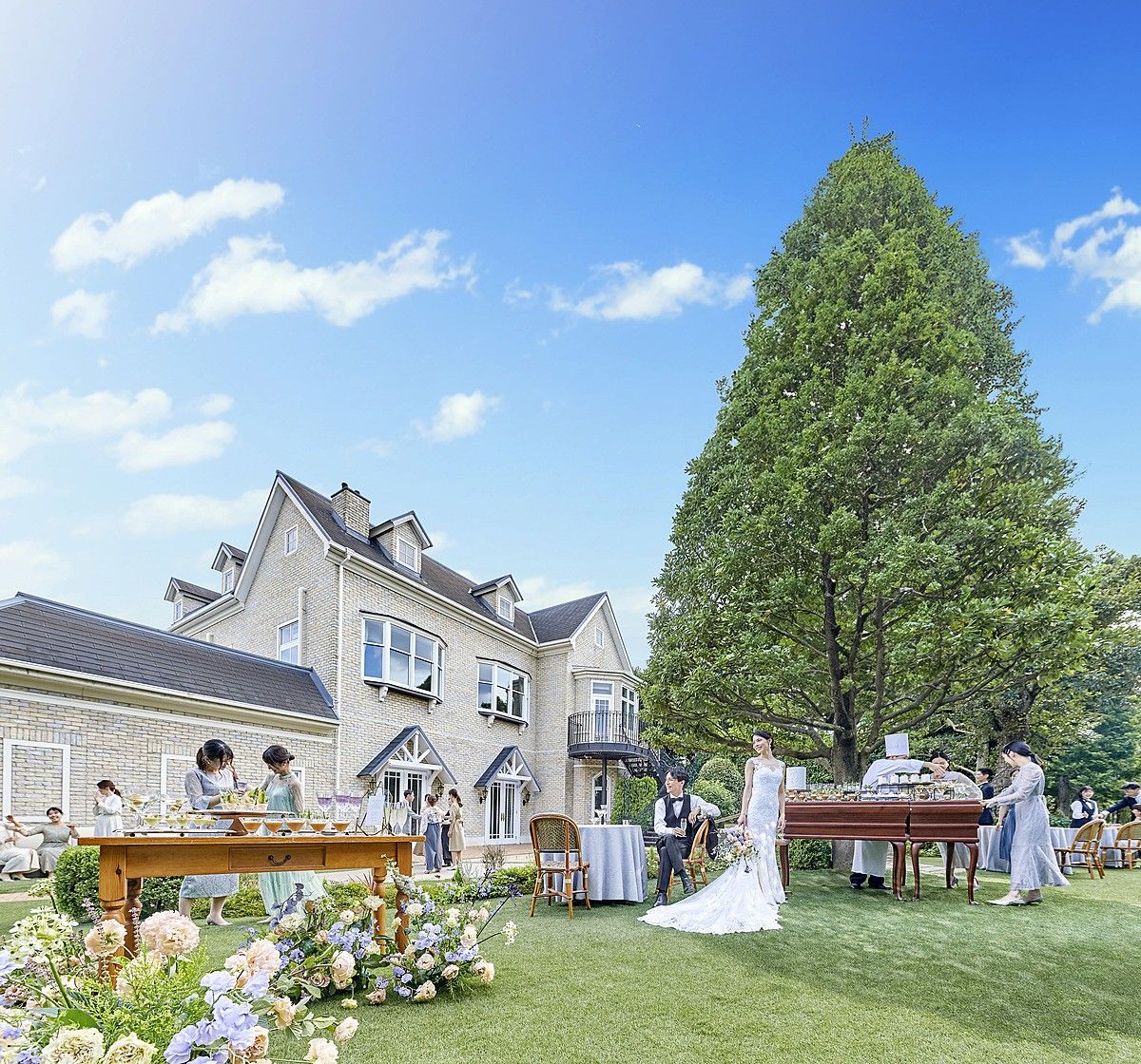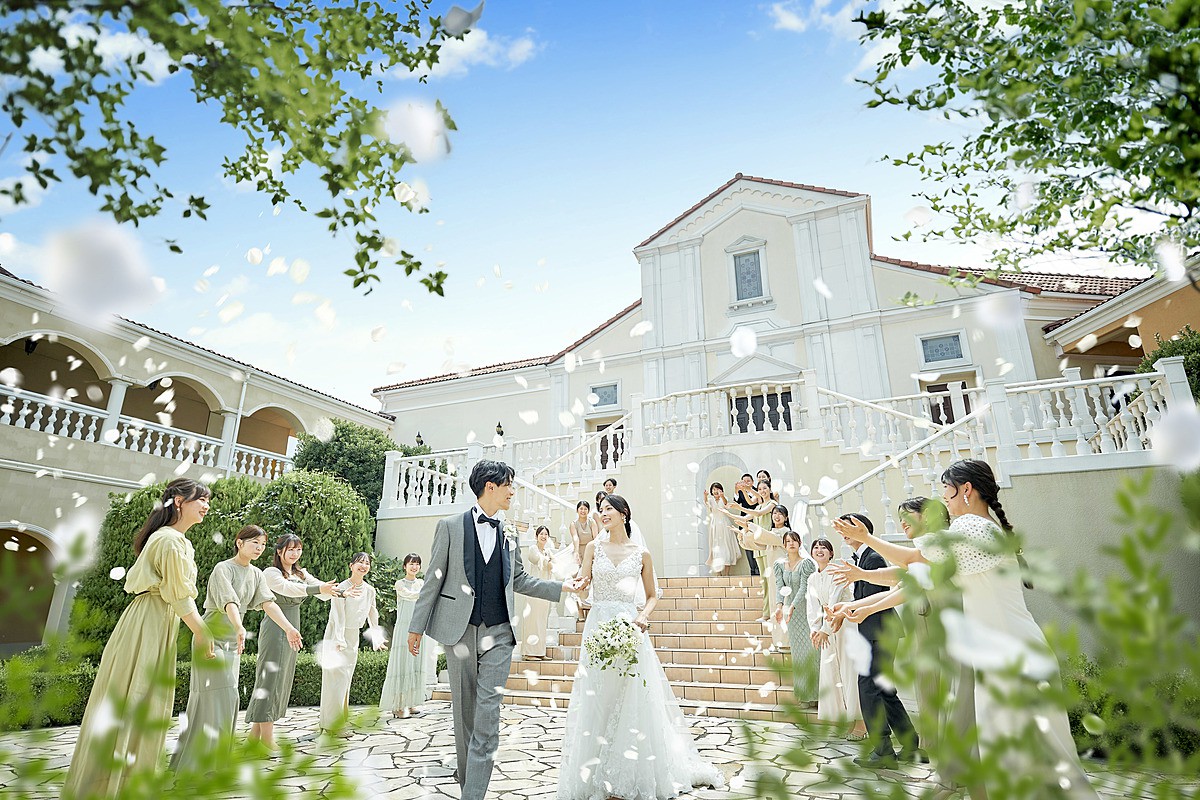美しい大聖堂での挙式、大階段でのフラワーシャワー、広大なガーデンで青空のもと楽しむビュッフェタイム…など、内容も海外ウエディングさながら。