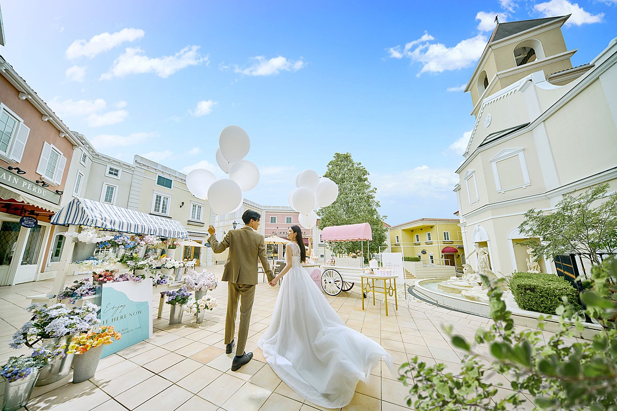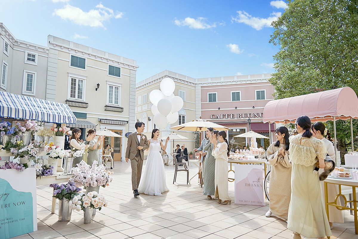 会場に一歩足を踏み入れると、広がるのはヨーロッパの世界観。フランスやイタリアの街角のように石畳や街灯、カラフルな建物が立ち並び、敷地内にはゲストが利用できるジェラートワゴンやカフェまで!