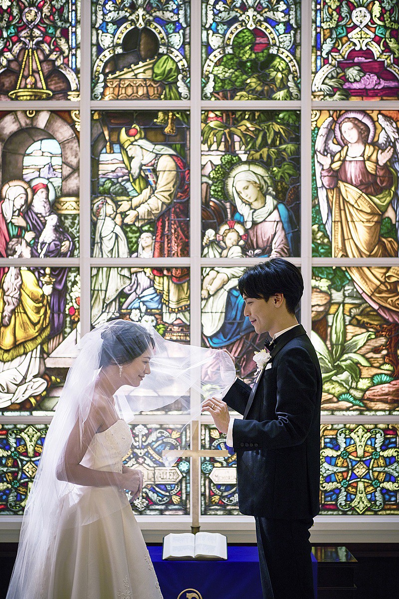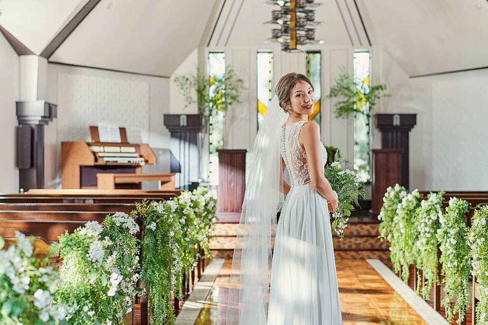 祭壇奥には見上げるほど大きなアンティークステンドグラスが輝き、花嫁の立ち姿をとびきりドラマチックに見せてくれます。