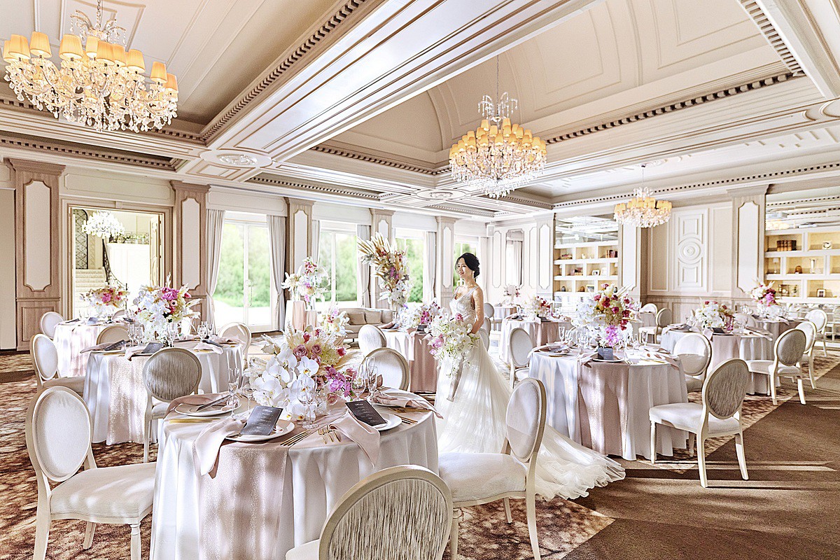 頭上ではクリスタルシャンデリアが光を集めて虹色に輝き、二人を優しく祝福します。