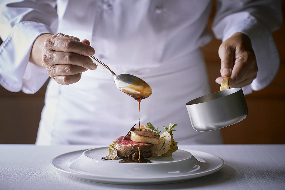 ゲストの目の前でスープを注いで料理の完成を見届けてもらうなど、「五味五色五法五感+六感で楽しむ“食体験”」を大切にしています。