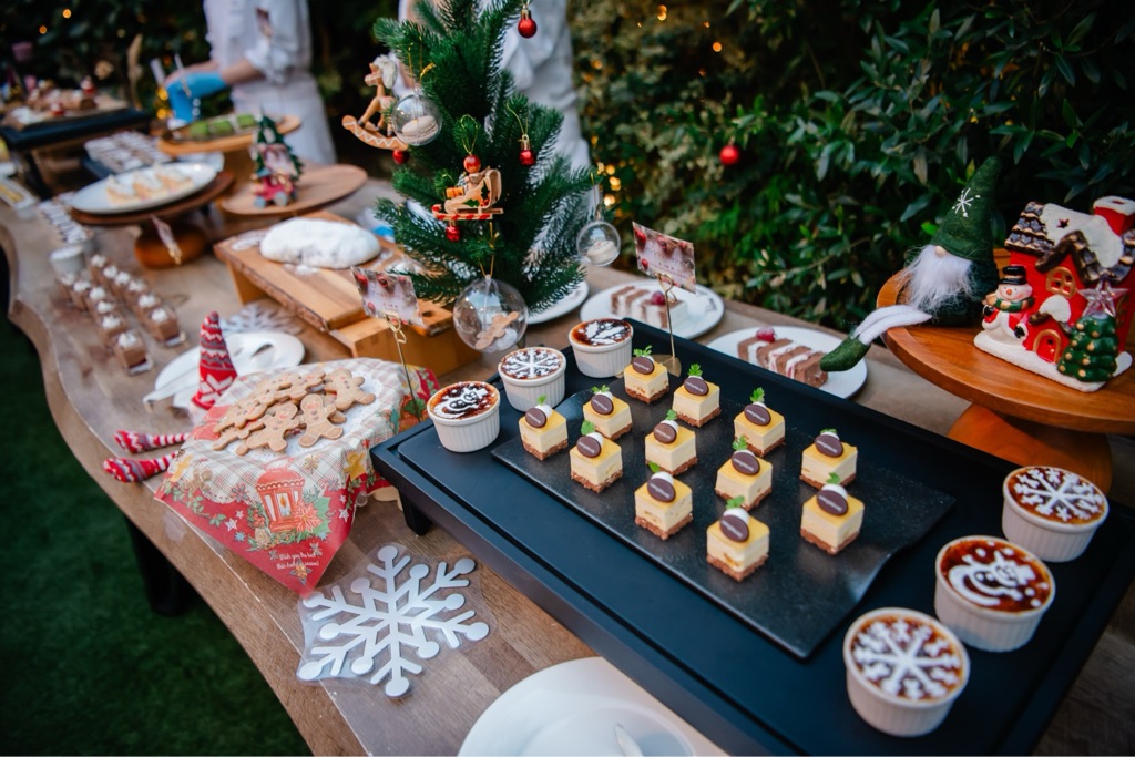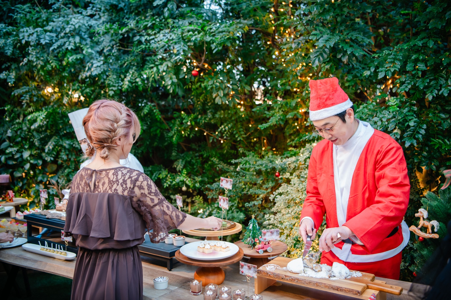 クリスマスマーケット風の料理が並び、ホットワインやチュロス、ガーデンで焼かれるソーセージがゲストに大好評でした。