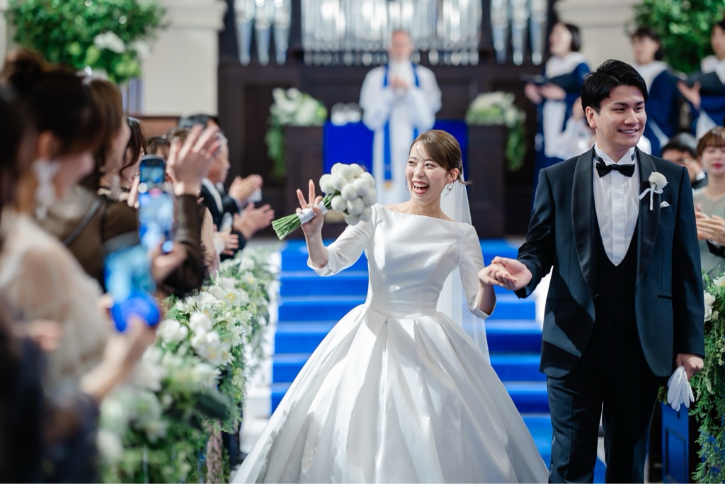 ウエディングドレスを引き立てるロイヤルブルーのバージンロードと、幻想的な雰囲気を創り出す照明の演出が魅力的でした。