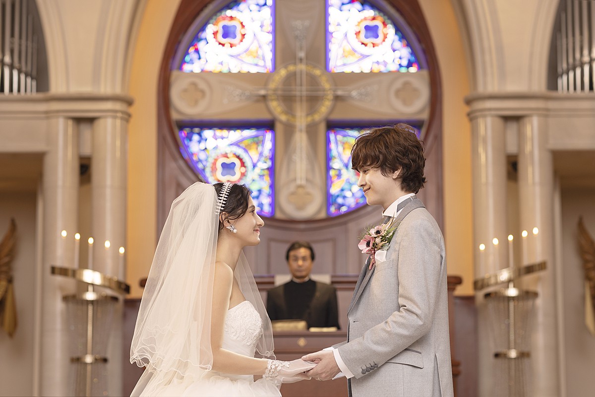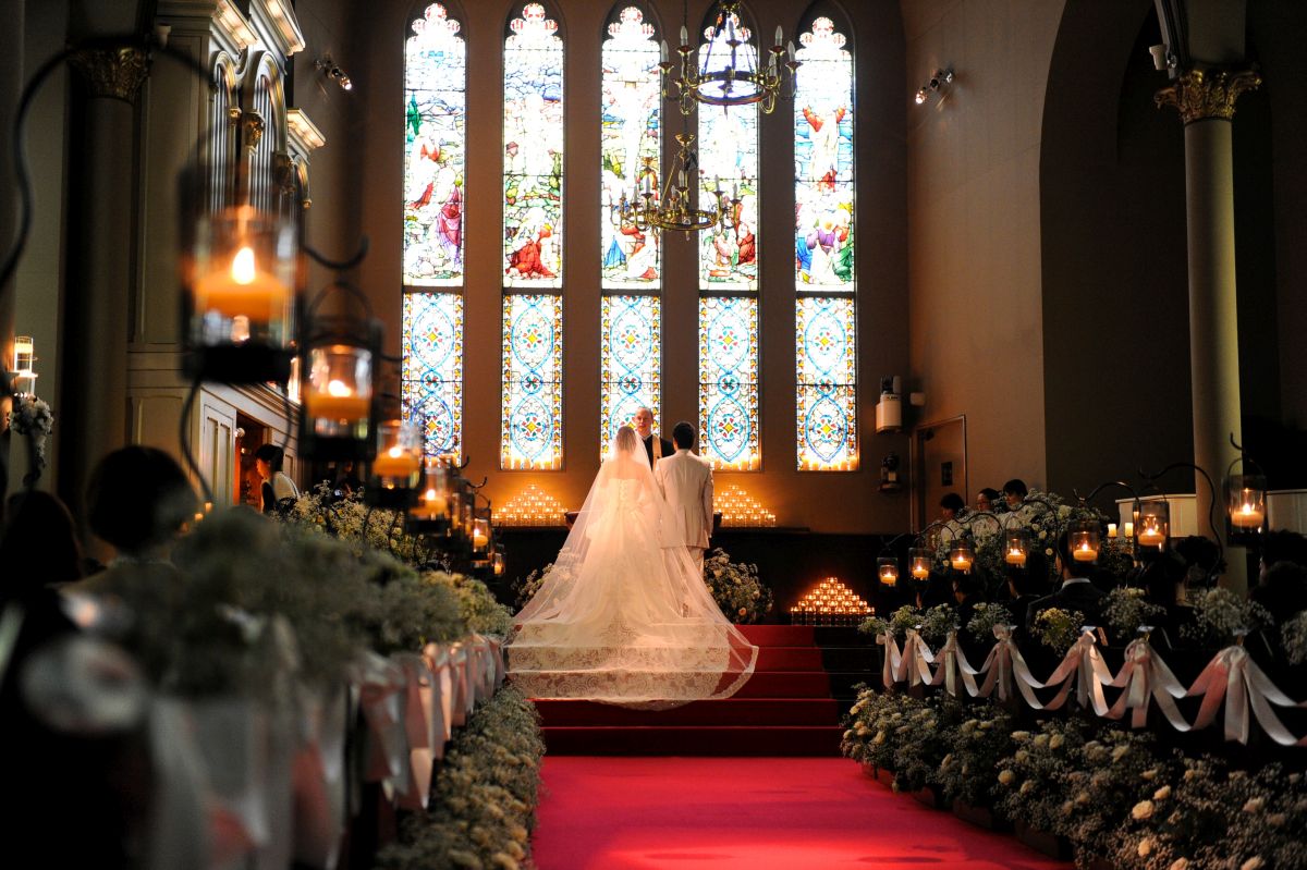 アンティークのステンドグラスやパイプオルガン、真紅のバージンロード、白いバラなどが、感動的な挙式を演出します。