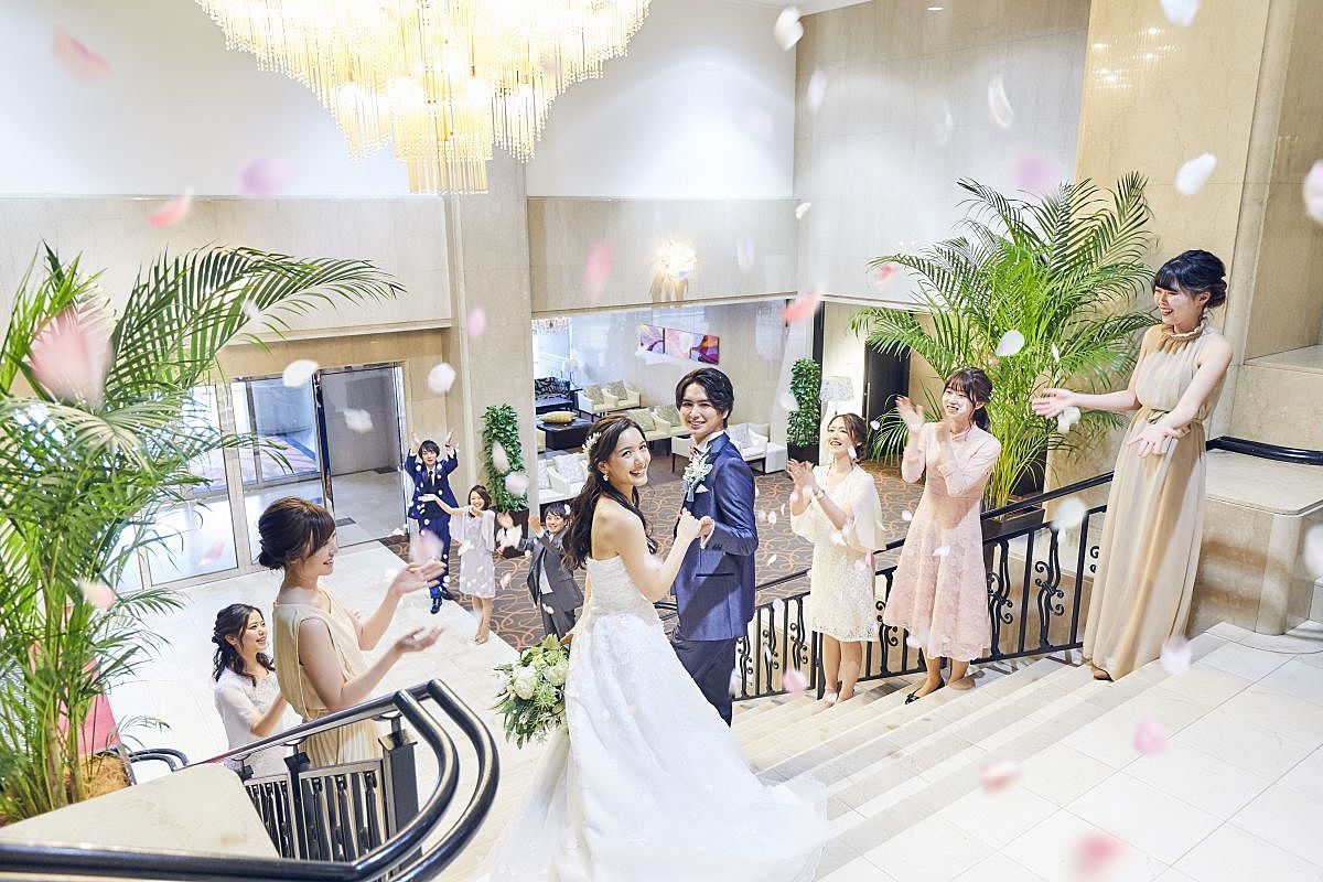 「ザ・ウィングス海老名」は天候に左右されない全天候型の結婚式場なので、大階段でのフラワーシャワーなどの演出も安心して執り行うことができます。