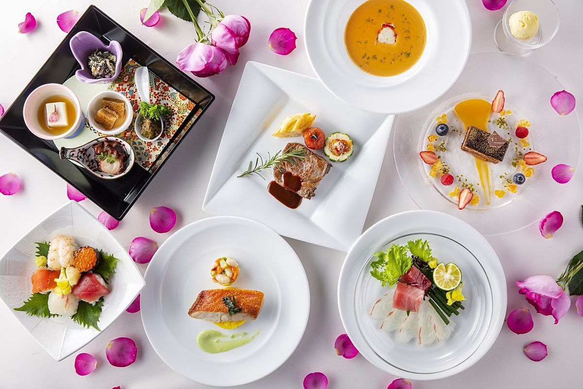 世代問わず喜ばれる日本料理をはじめ、素材の持ち味を存分に活かした華やかなフランス料理や「西洋料理×日本料理」の色鮮やかな和洋折衷コースからもセレクト可能です。