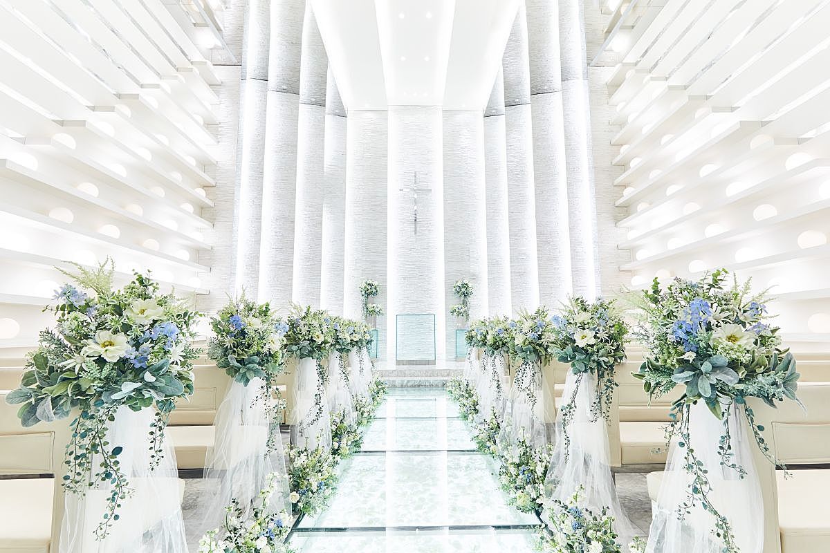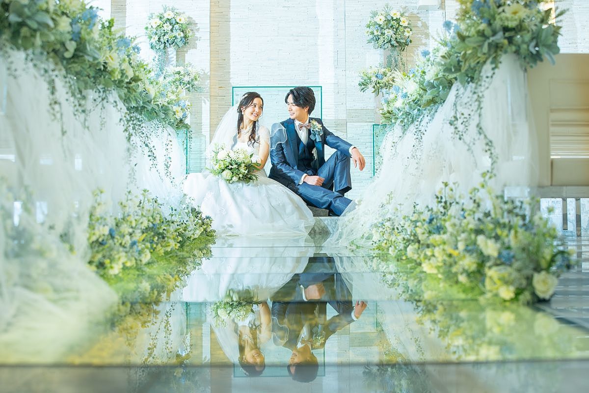 中央に伸びるガラスのバージンロードには、花々が埋め込まれており、様々なセレモニーシーンでふたりを美しく演出してくれます。