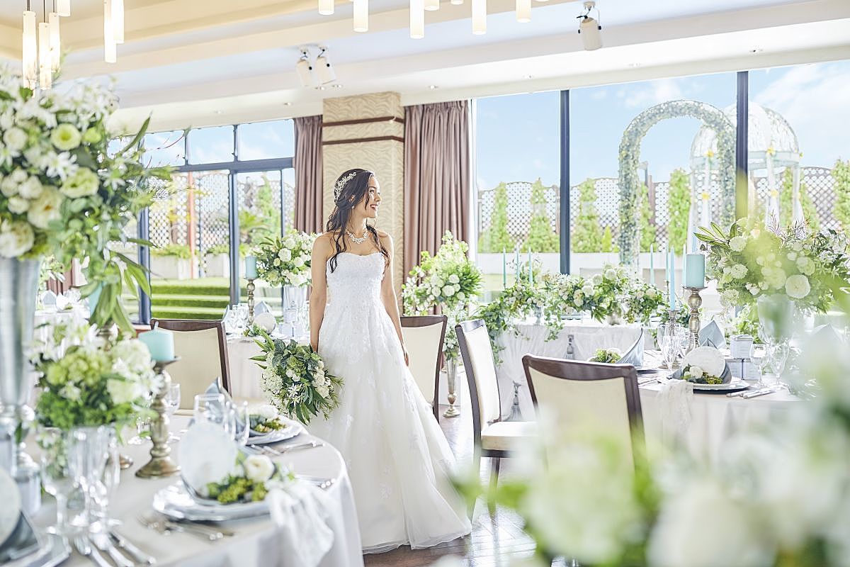 大きな窓からたっぷりの日の光が差し込み新郎新婦を美しく照らすこちらの会場は、開放的なパーティを楽しみたいふたりにピッタリの会場です。