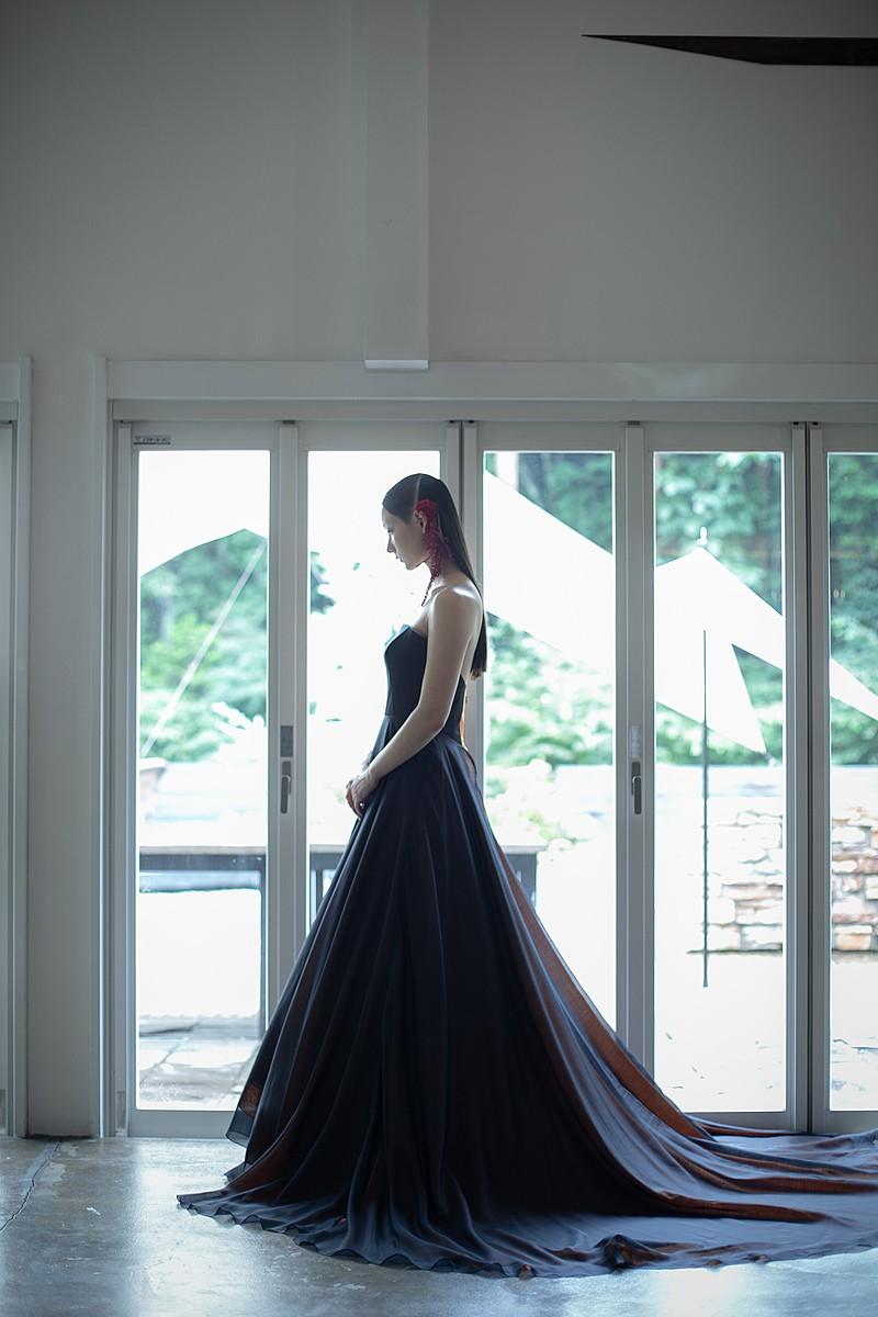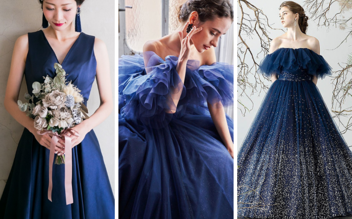 ウエディングドレスの中でも、しっとりとした気品をまとうのが「ネイビードレス」。