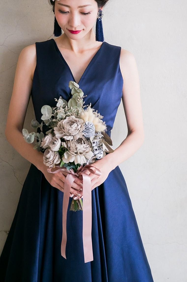 シルエットや素材感、そしてなりたいイメージに合わせて、ブーケやアクセサリーを選ぶことで、ネイビードレスならではの奥行きのあるコーディネートが完成します。
