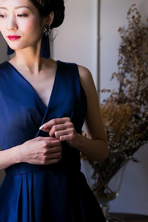 動くたびに濃淡と光沢が美しいニュアンスを作るネイビーのカシュクールドレス。