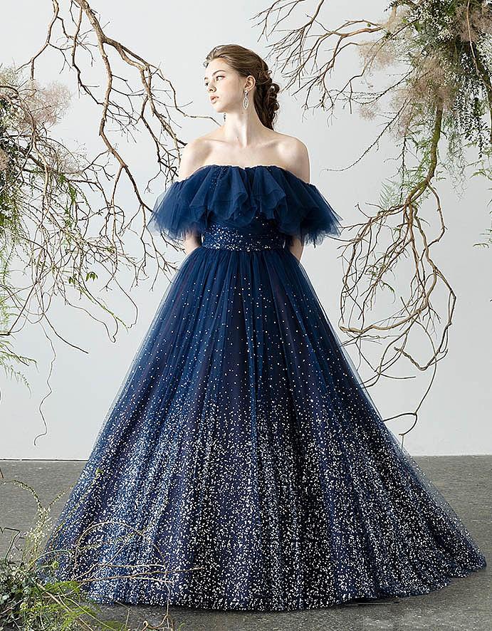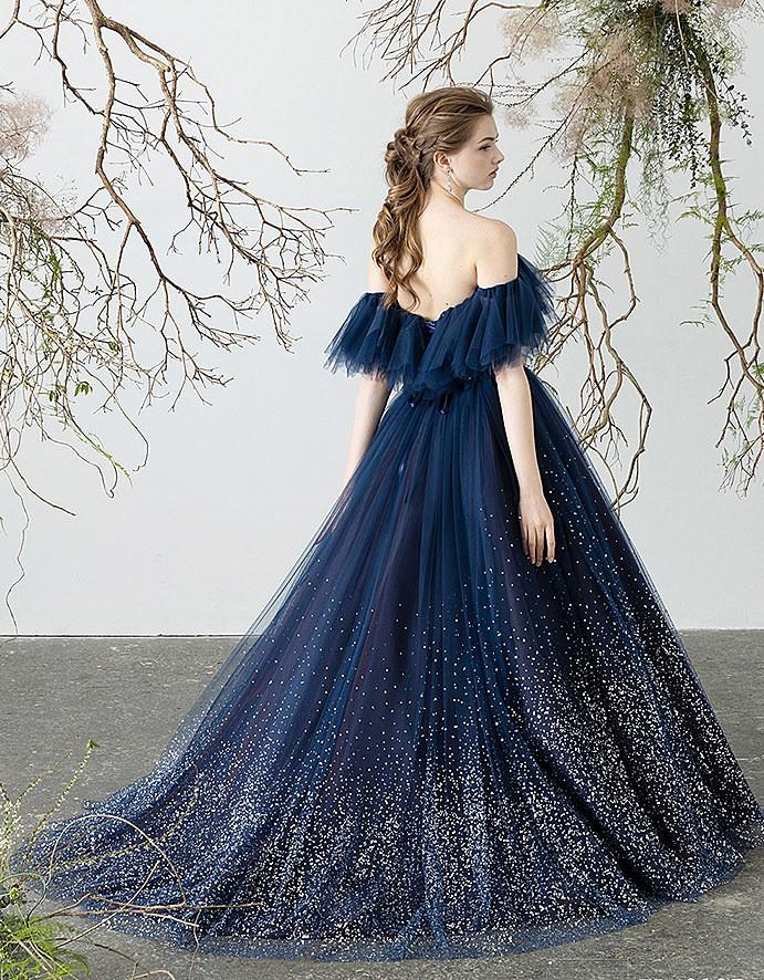ネイビーのソフトチュールにシルバーのグリッターをグラデーションのようにデザインしたオフショルダードレス。