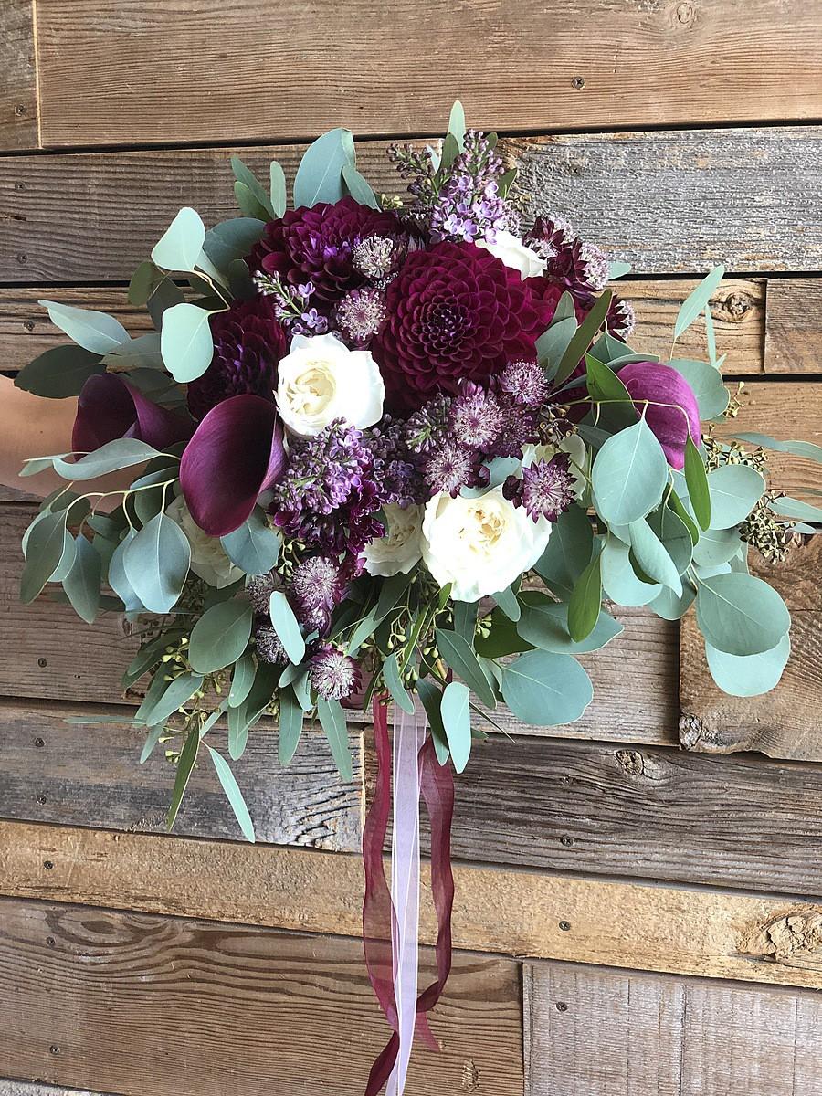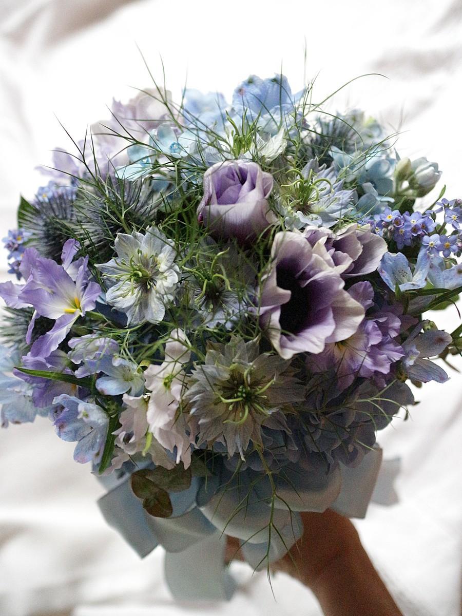 青紫のニュアンスやふわりとした柔らかいフォルムがドレスとリンクし、ドリーミーでロマンティックなムードをより一層引き立ててくれます。