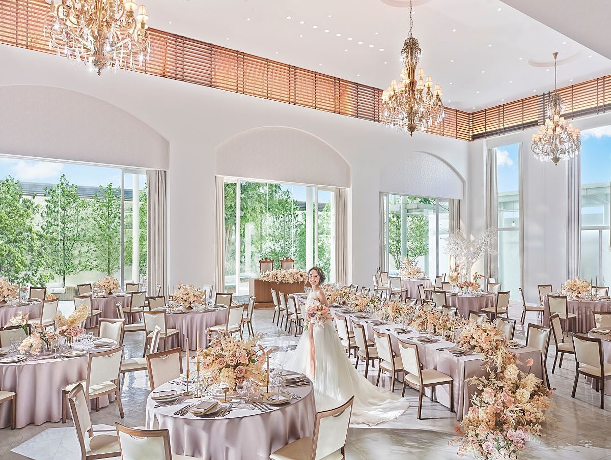 大きな窓の向こうに広がるさわやかなロケーションとやわらかな自然光に包まれる空間で、ヨーロッパの高級リゾートさながらのスタイリッシュなウエディングパーティに最適な会場です。
