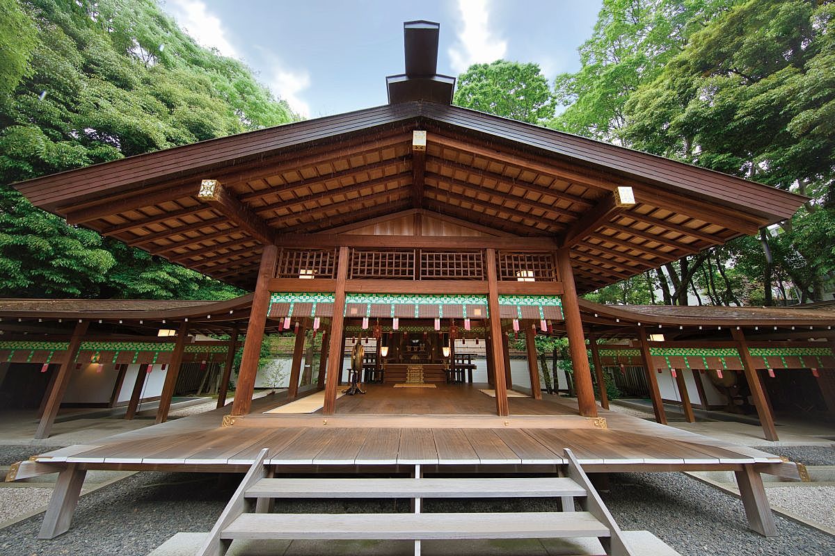 挙式を行う本殿は、都内唯一の半屋外社殿で結婚式への想いを込めて設計されたつくり。