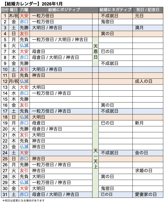 そこで今回は2026年1月の「結婚全般に縁起のいい日」と「内容によって縁起のいい日」、「要注意日」について解説。結婚イベントの日取りに役立ててくださいね。