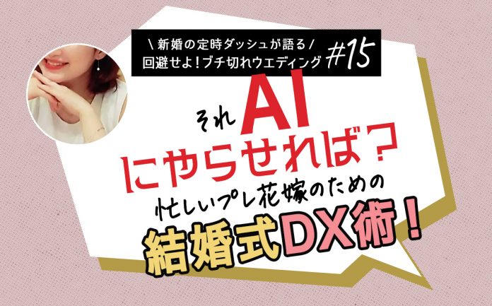 今回は「それ、AIにやらせれば?」忙しいプレ花嫁のための結婚式DX術!ということで、忙しすぎるプレ花嫁・花婿の皆さんに定時ダッシュ流、結婚式準備の活用法をお届けします。