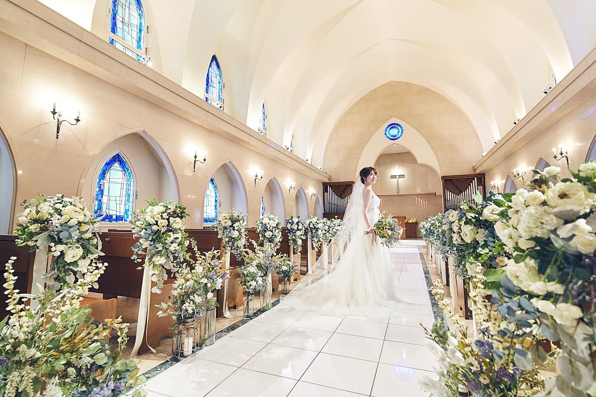 館内は天井高10m、白い大理石のバージンロード17mの長さを誇る広い空間の本格的チャペルです。