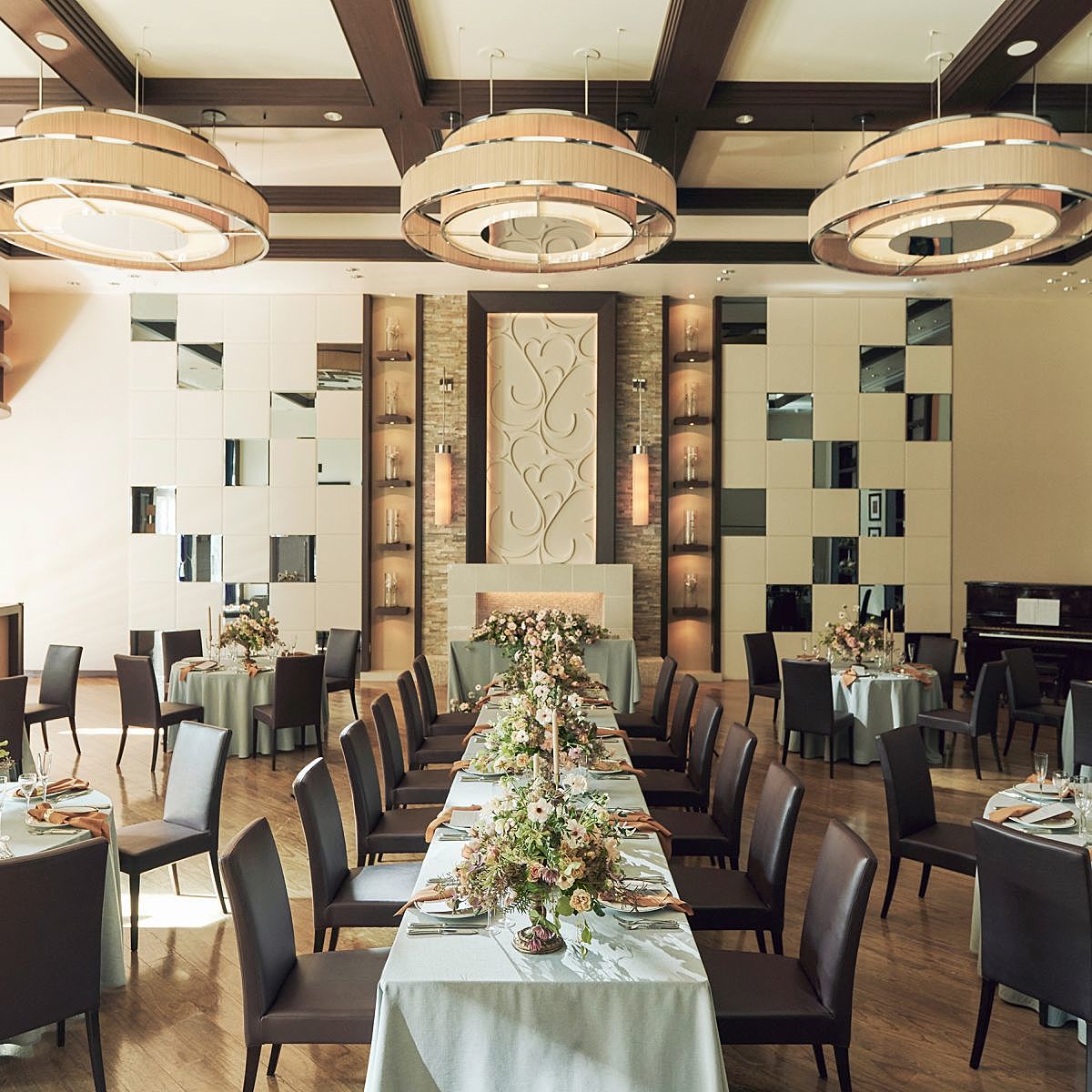 ブラウンカラーがアクセントの「レガート(収容人数6〜80名)」は、気品漂う大人な空間。