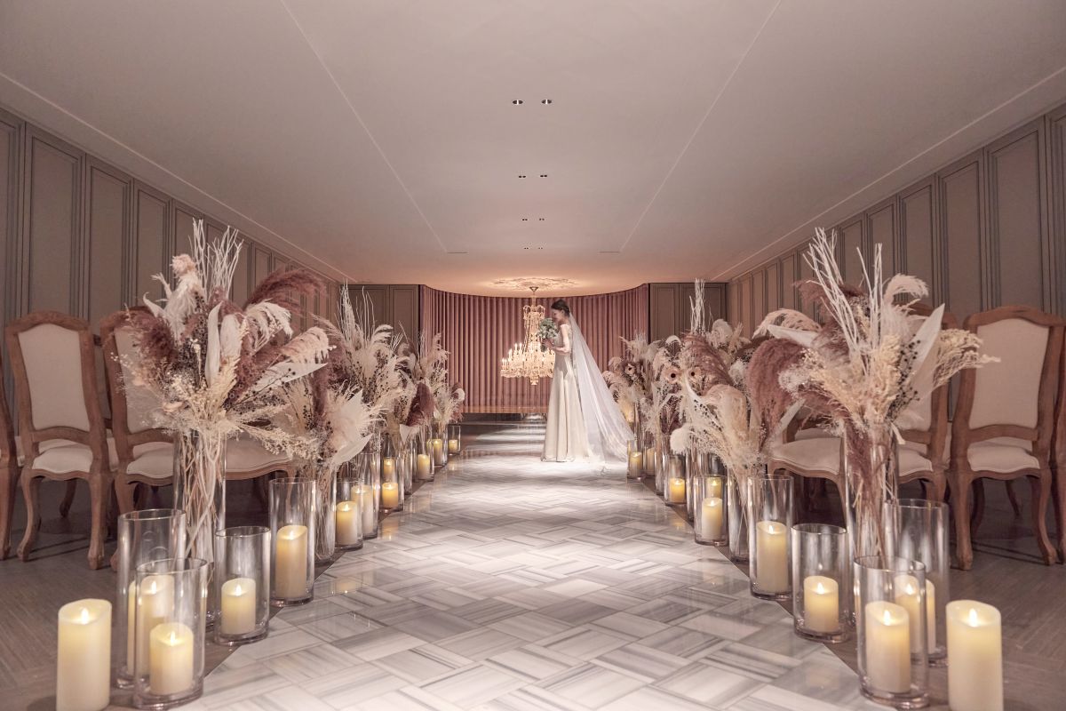 歩みとともに光が足元を照らし、その先の祭壇では「家族」をモチーフにしたバカラ社製の等身大シャンデリアが神聖な輝きを放ちます。