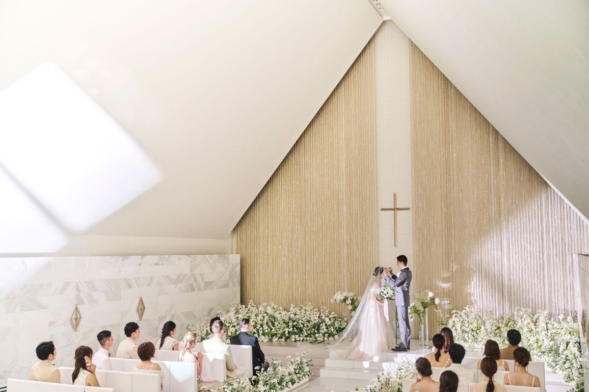 挙式会場は、バカラ社製シャンデリアが輝くチャペル「聖なる祈りの宝石箱(収容人数58名)」。