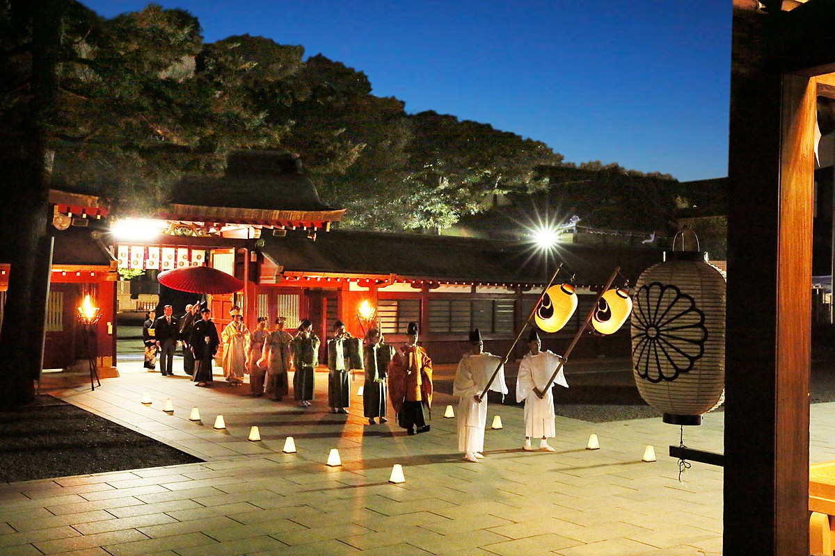 同神社では、9〜12月・2〜3月のみ、夕刻の「かがり火挙式」が可能。1日1組限定でプレミアム感はバツグンです。
