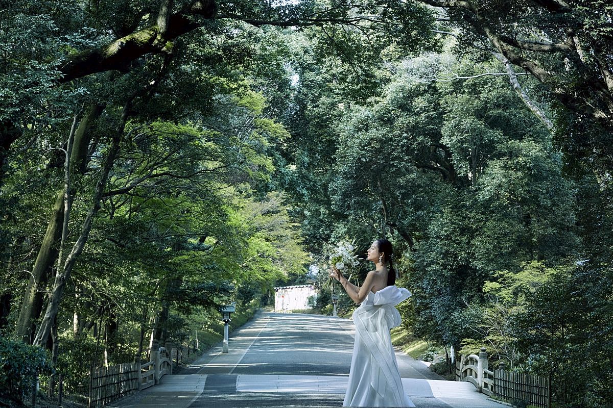 木漏れ日を受けて進む花嫁姿はなんともフォトジェニックで、神聖に感じられます。