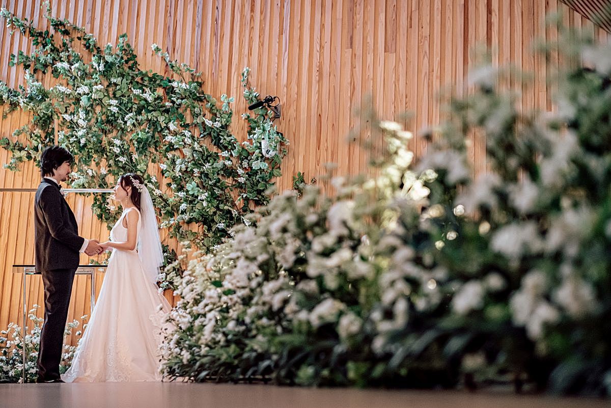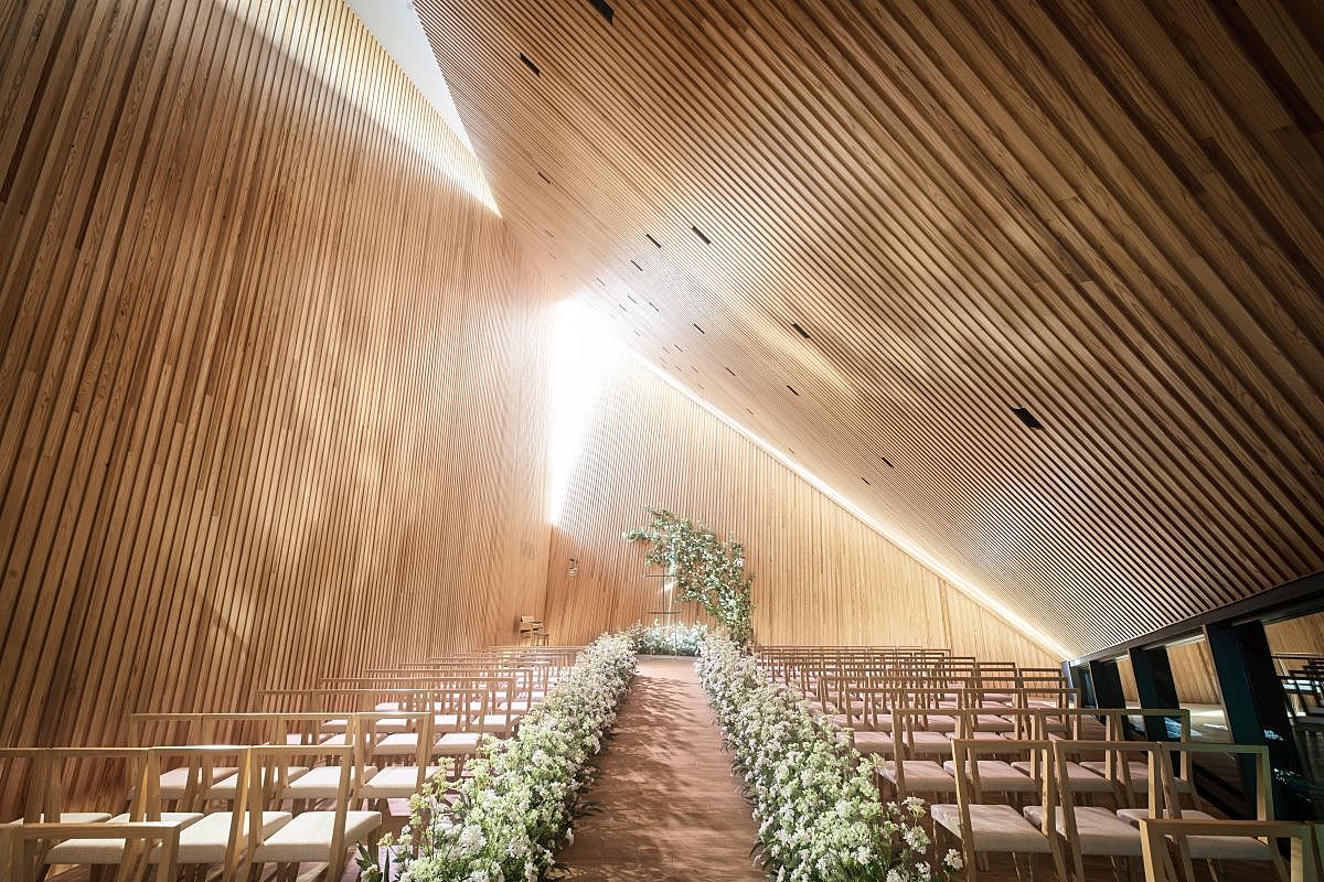 高さ14mの天井からは柔らかな自然光が降り注ぎ、木のぬくもりに包まれる挙式シーンはとびきりナチュラルでフォトジェニック。