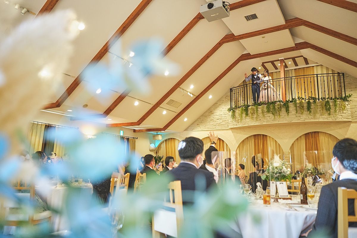 天井の高い吹き抜けのパーティ会場で、館内は2フロア分の高さがあります。