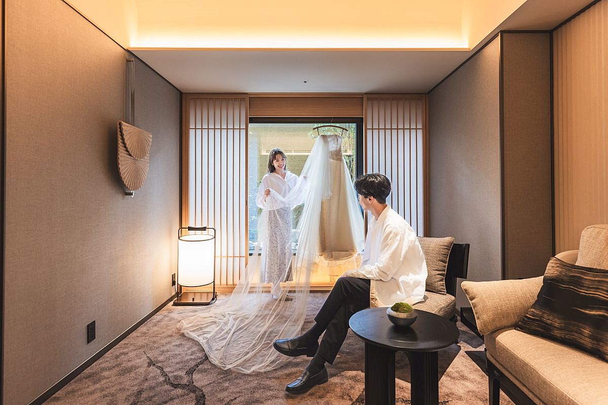 客室は、畳や障子、襖など日本の伝統を取り入れたスタイリッシュモダンな空間で、ラグジュアリーホテルならではの「ステイウエディング」もおすすめ。