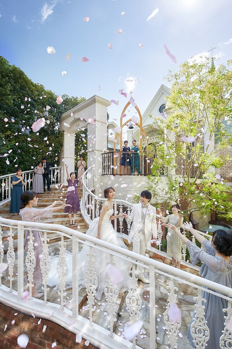 挙式後の「幸せのらせん階段」でのフラワーシャワーは、さらにゲストとの距離を縮めてくれますよ。