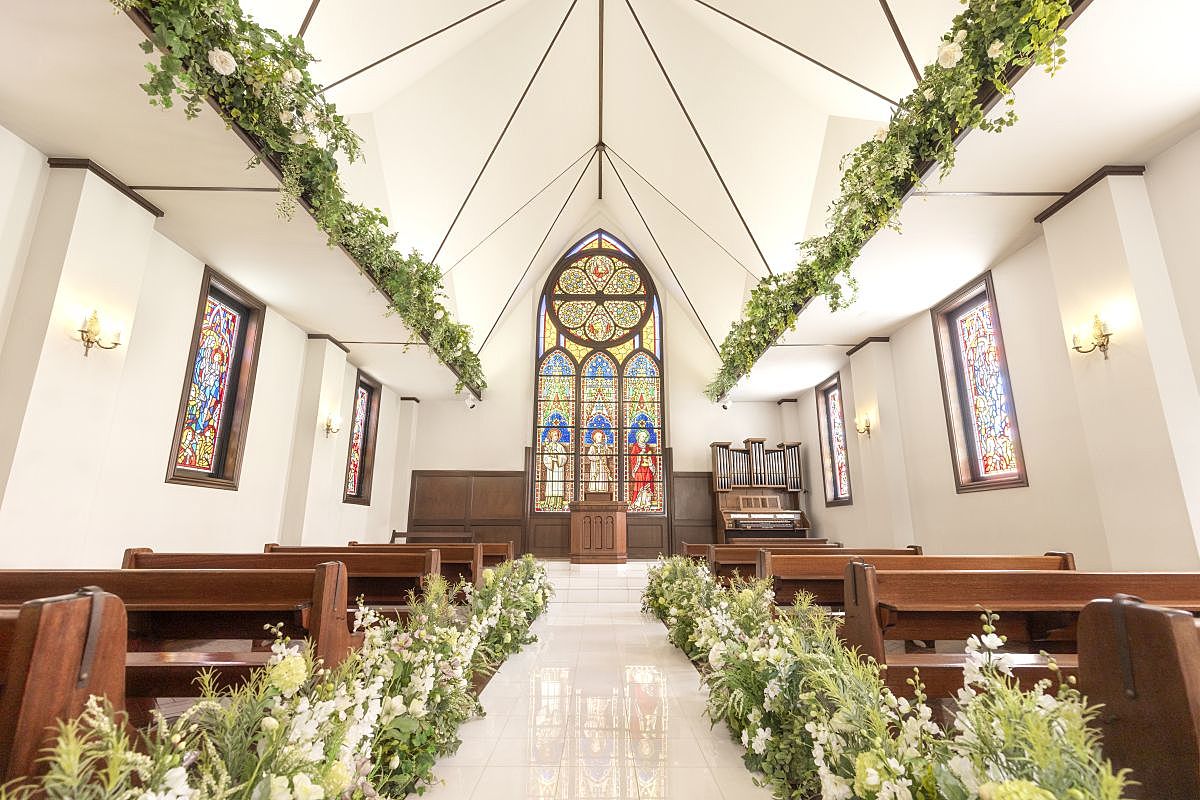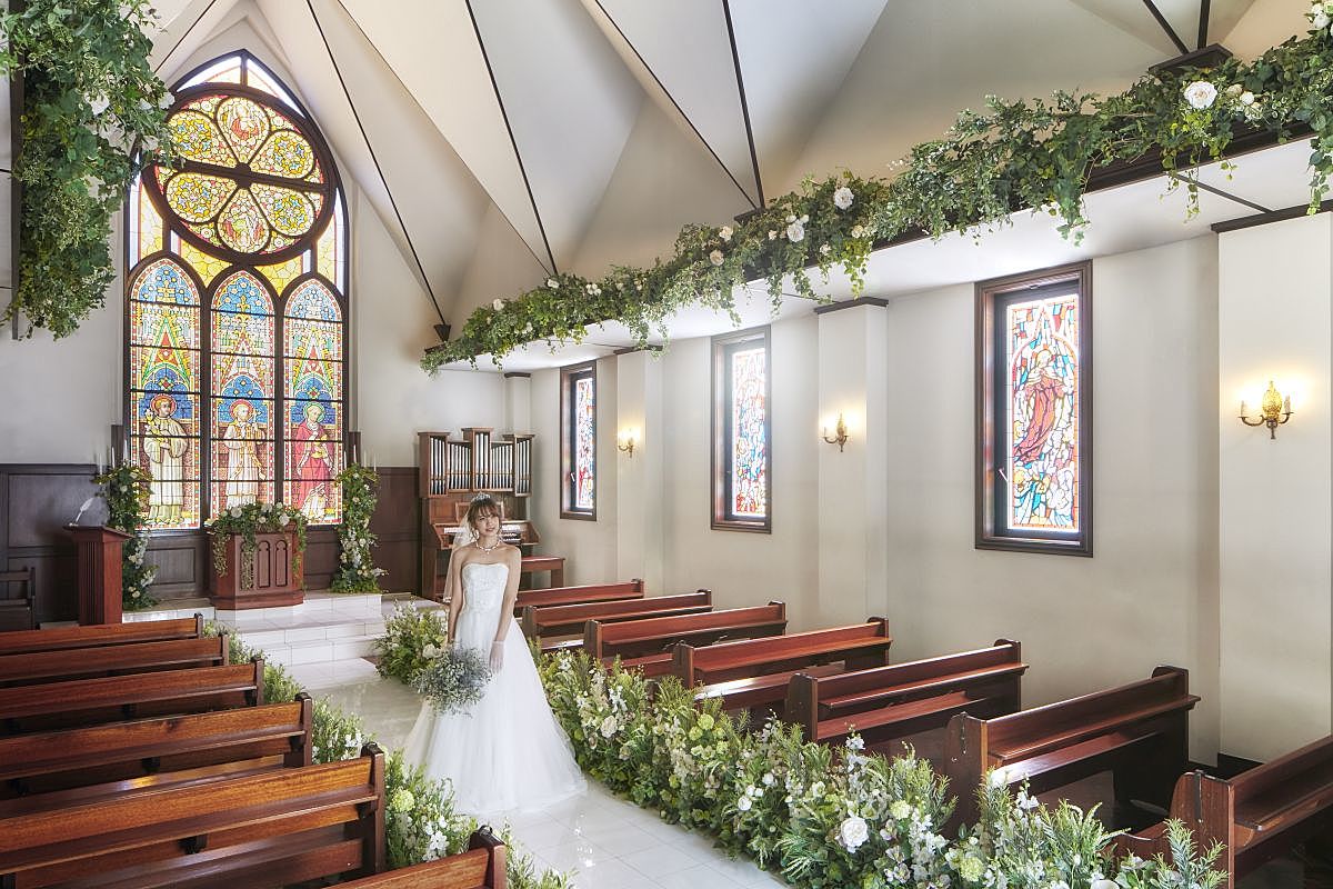アンティークなステンドグラスの幻想的な光とパイプオルガンの音色に包まれる、いわゆる「王道挙式」が叶うチャペルです。