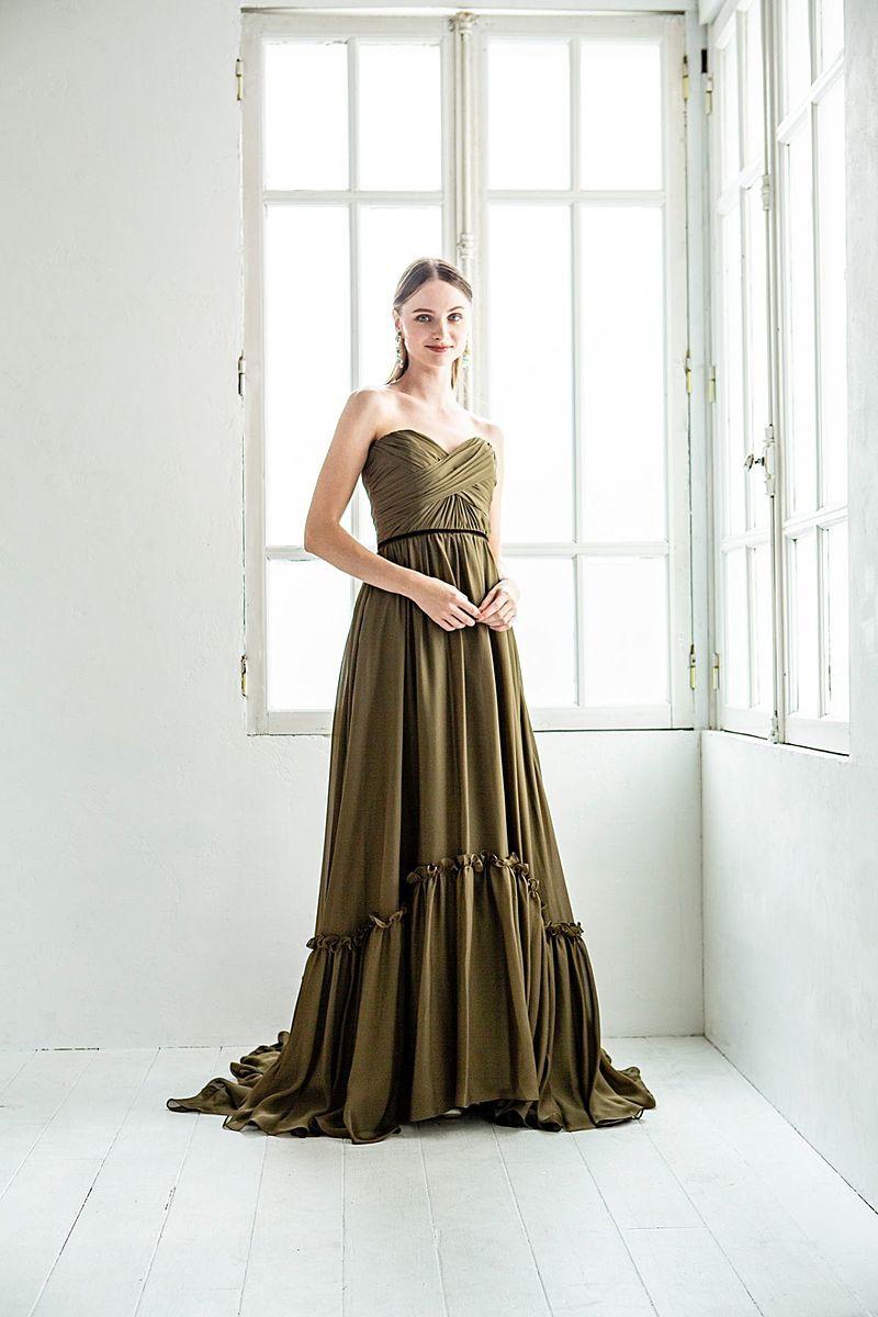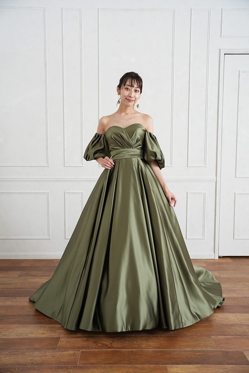 なめらかで艶のあるソフトサテンの光沢が美しいドレスは、深みのあるカーキカラーが大人の落ち着いた雰囲気を漂わせます。