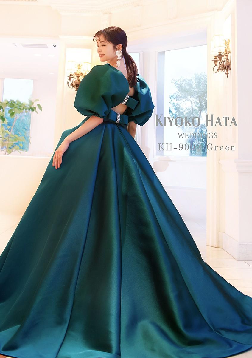 2.[KIYOKO HATA]ダークグリーン×タフタのバックリボンパフスリーブドレス