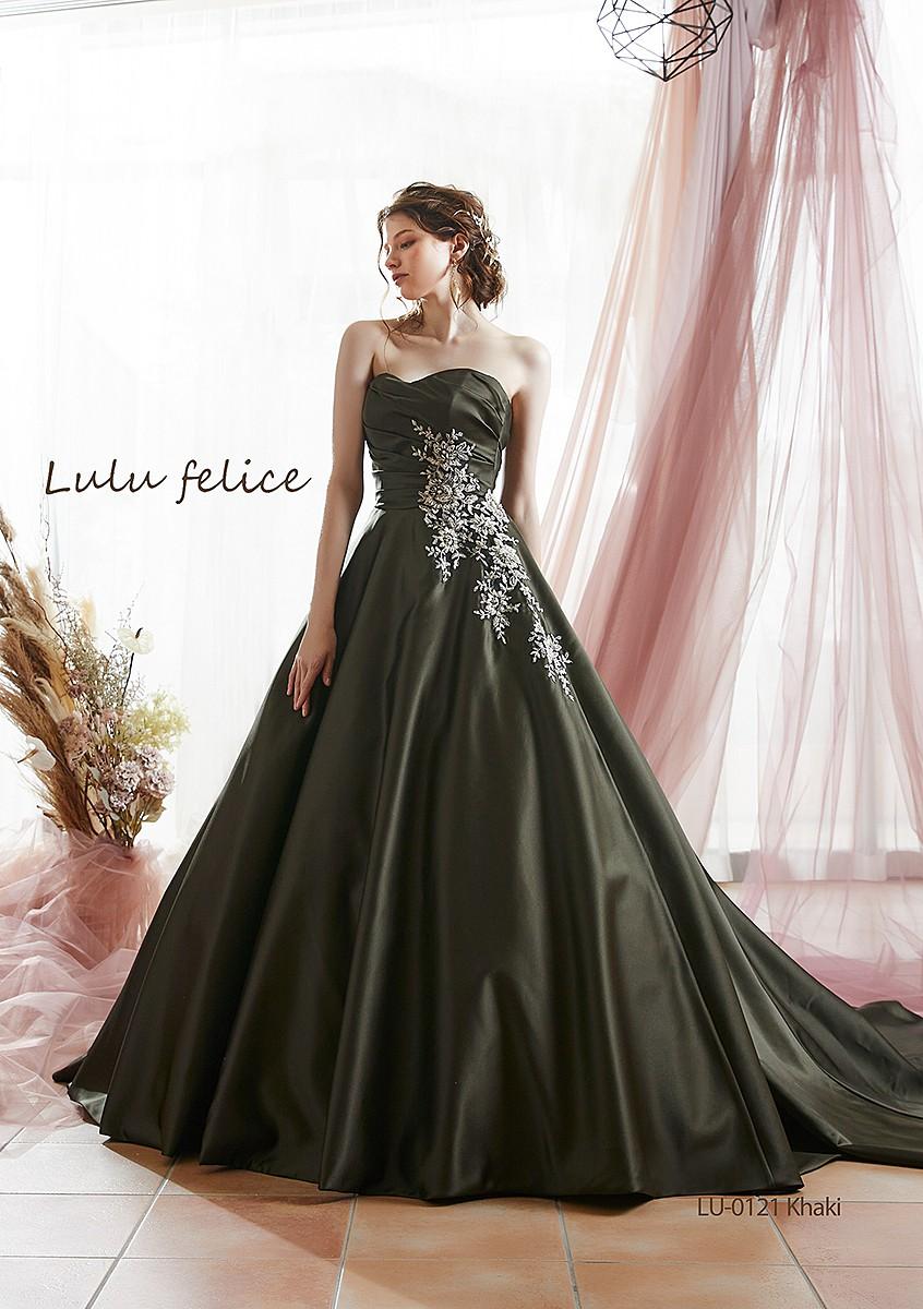 3.サテン素材のカーキグリーン×ビーディングレースのAラインドレス