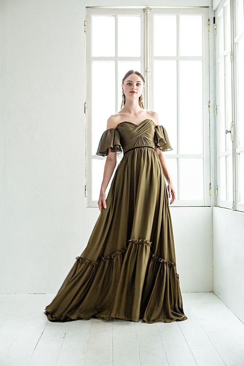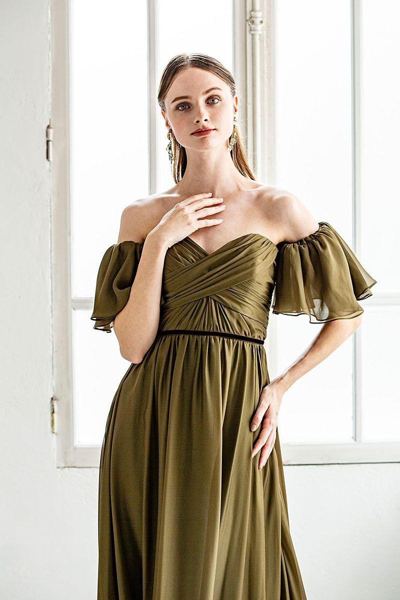 4.オフショルダー×オリーブカラーの2WAYスレンダーラインドレス