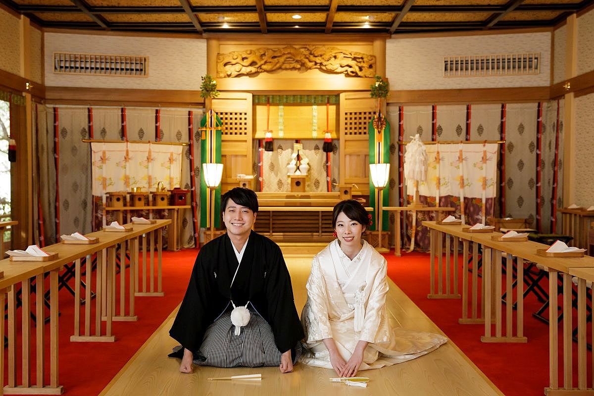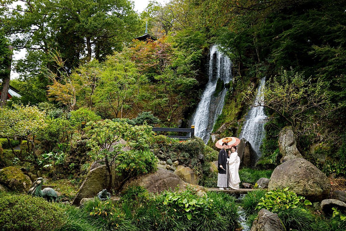 挙式前には、日本庭園内の滝をバックに親族と共に一歩ずつ神殿へと歩みを進める“三進の儀”を実施。