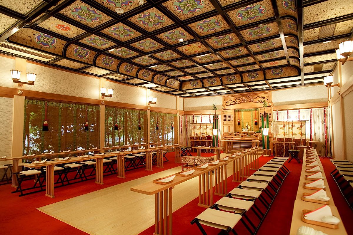 趣のある内装の独立型神殿。“縁結びの神様”として全国的に知られている出雲大社の分殿で、厳かな雰囲気の中で古来より伝わる伝統的な神前式が叶います。