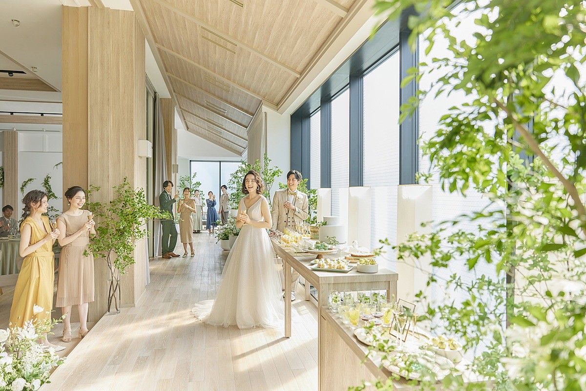 ゲストと必ず言葉を交わせるウェルカムパーティー、派手な演出をしなくても景色がおもてなしになる空間は、ゲストにしっかり「ありがとう」を伝えるための時間を作ってくれるはずですよ。